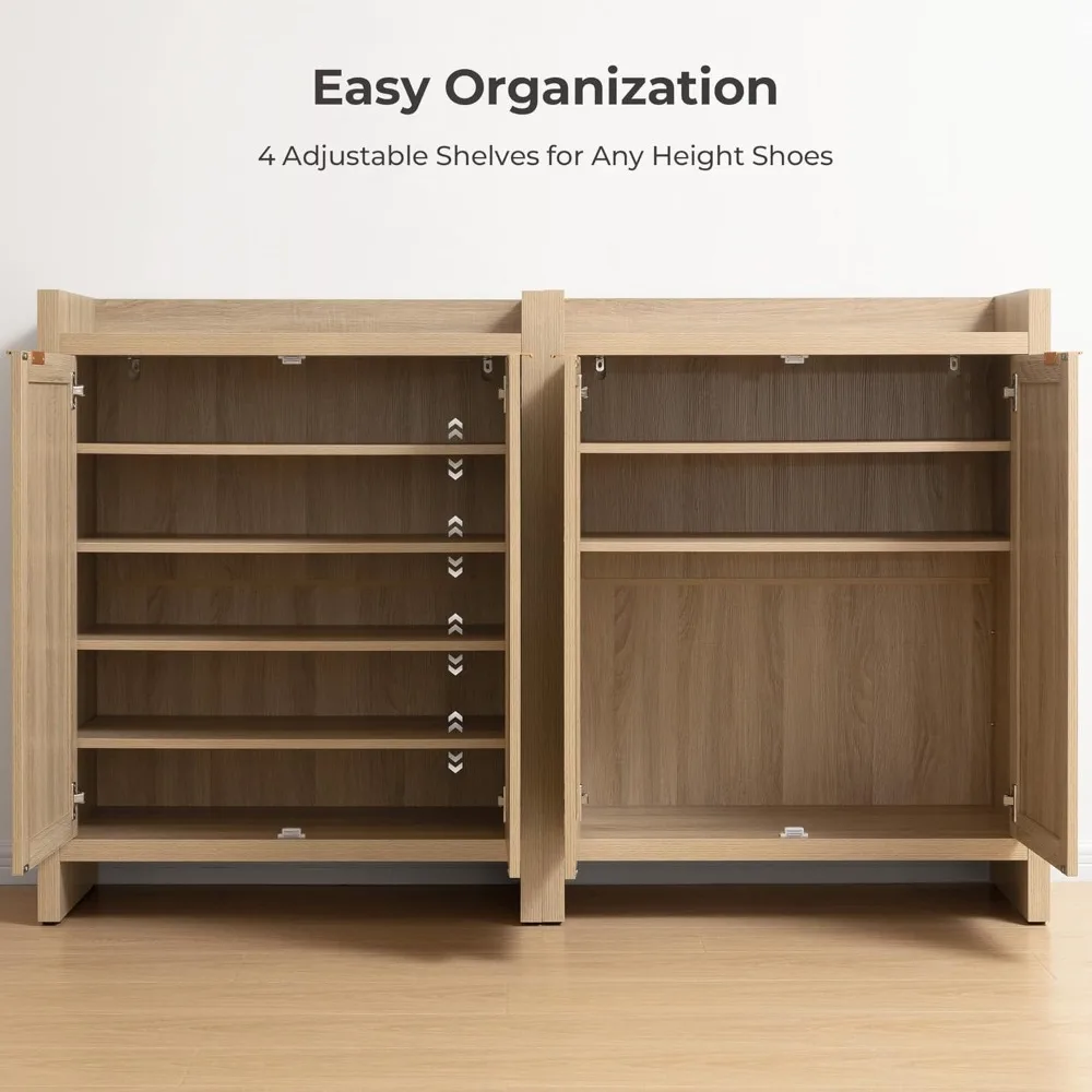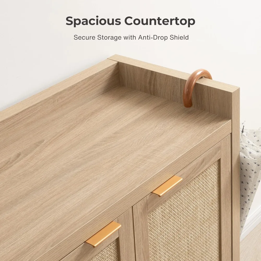 This shoe cabinet is a timeless design that combines classic rectangular rattan doors, offering a rustic and bohemian appeal, making it suitable for various home decor styles. It features six adjustable shelves that can hold up to 55 lbs on the interior and 66 lbs on the top, providing ample storage for your valuable items. The cabinet's wood grain surface is easy to clean and scratch-resistant, while its integrated leg frame ensures stability and durability. Assembly is straightforward with clear instructions and all necessary parts included, making it ready for use quickly. We offer a dedicated customer service team for any issues, a 60-day exchange and refund policy, and a 12-month warranty. For safety, attach the cabinet to the wall with the provided anti-tip kits. If doors appear uneven or have gaps, adjust the hinge screws as per the manual. The frame is crafted from FSC-certified wood for environmental sustainability. Remember to attach small fasteners to the back and tighten screws at a 45-degree angle for added stability.