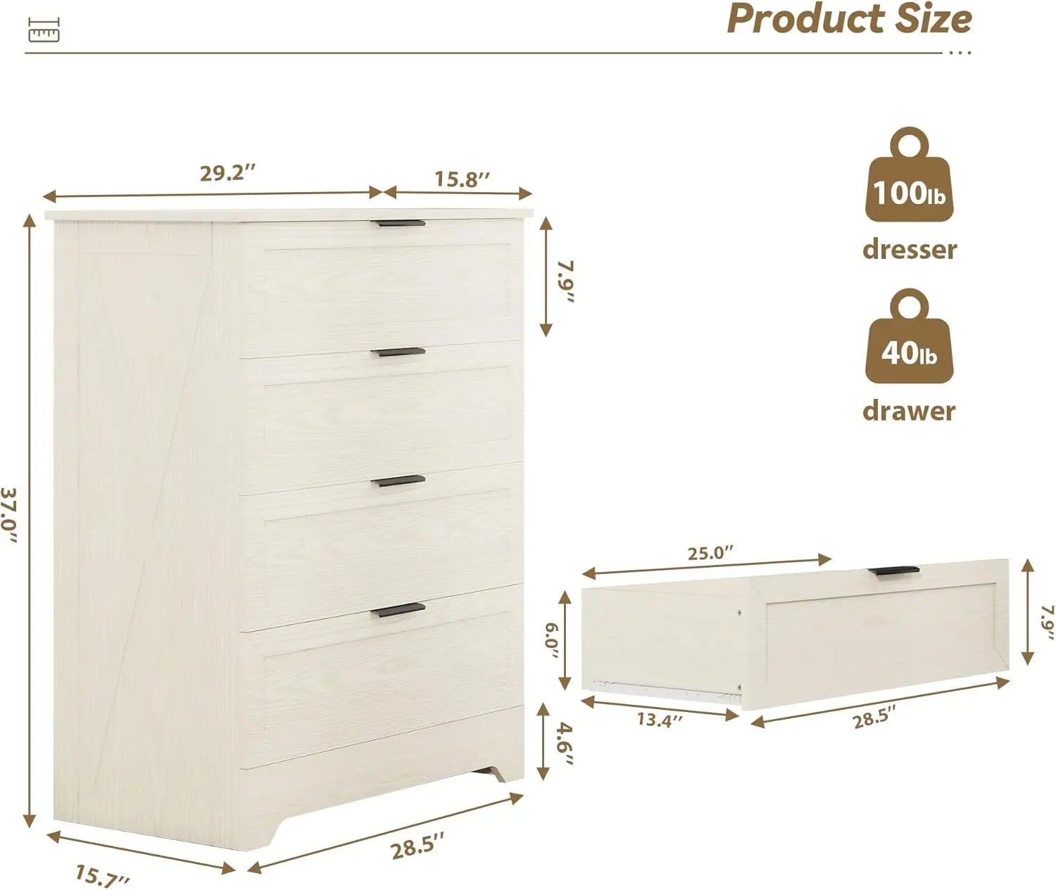 Dimension & Assembly: Overall dresser size is 29.2*15.8*37 inch (L*W*H) and will take advantage of every space to achieve more storage area for you. We provide a straightforward manual for assembly; you can get the new 4 drawer dresser within 2hrs. Any questions or concerns can be addressed by the responsive customer service team.