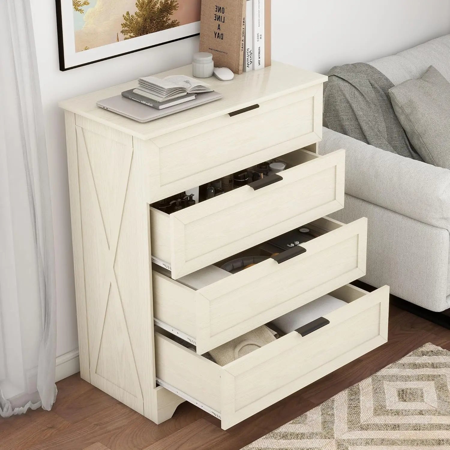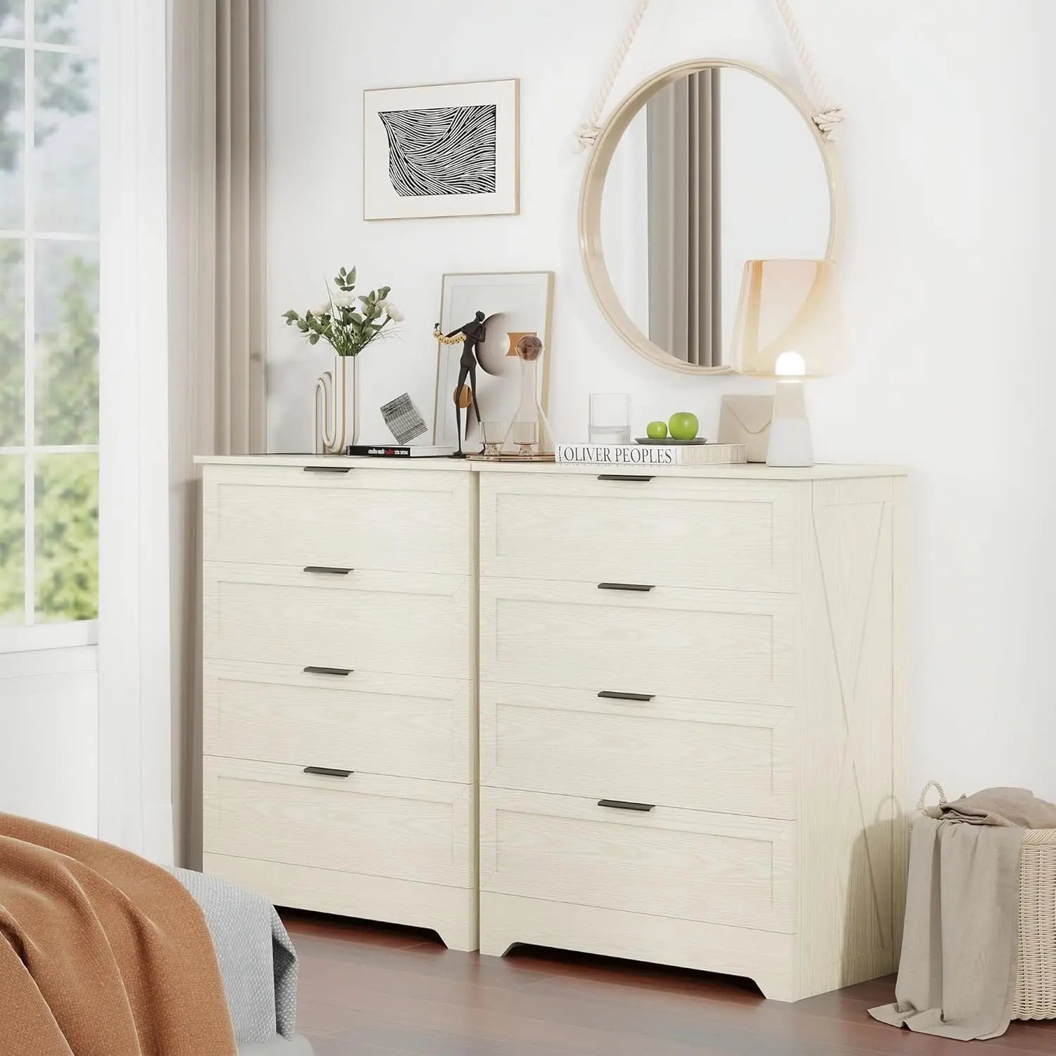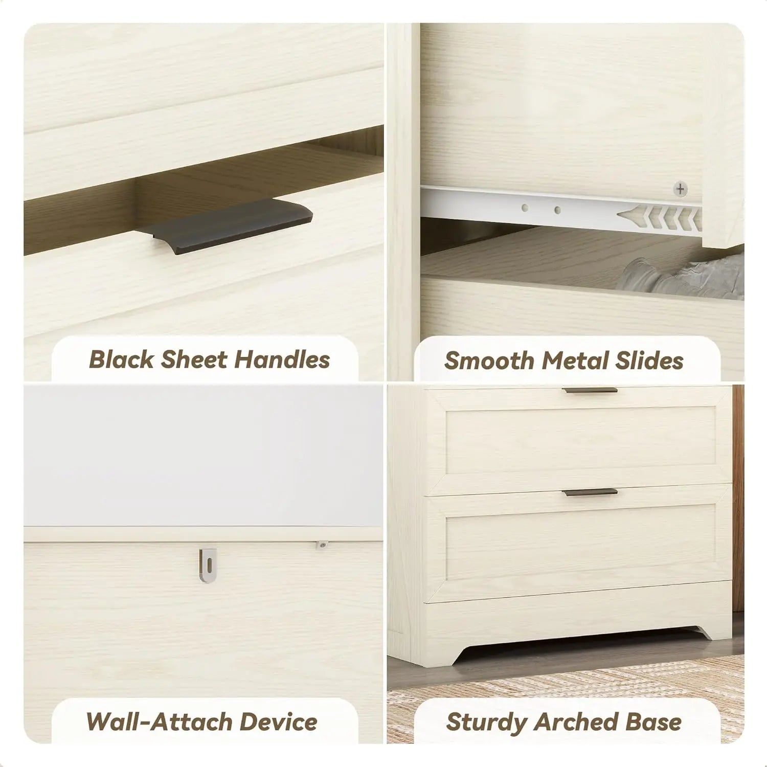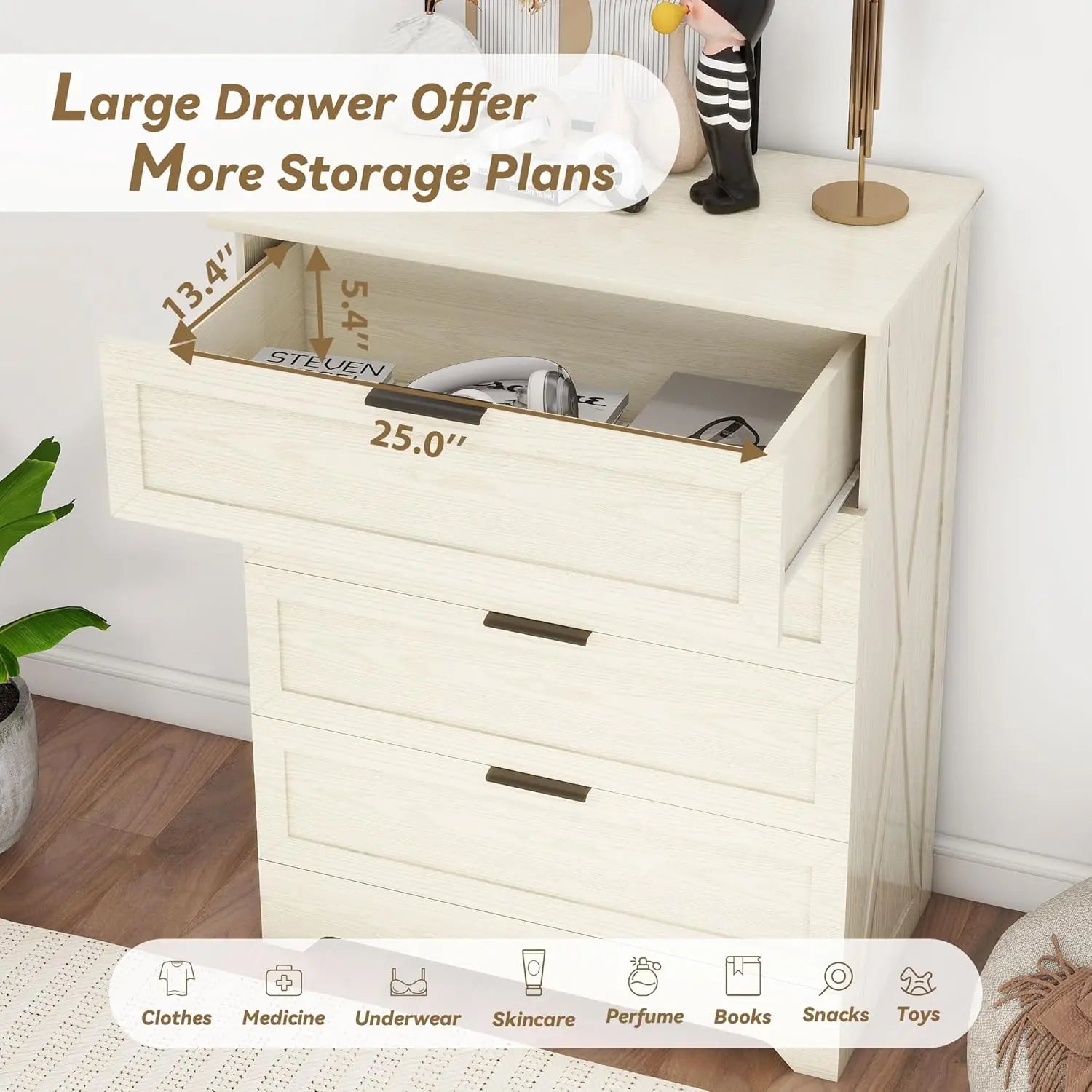 Elegant Designed Dresser: The white grain finish and black drawer pulls give this chest of dresser a modern and minimalist look. The arched open design on the sturdy base adds an elegant touch, making it a stylish addition to any living space. The X shape on the side also combine farmhouse charming in modern design.