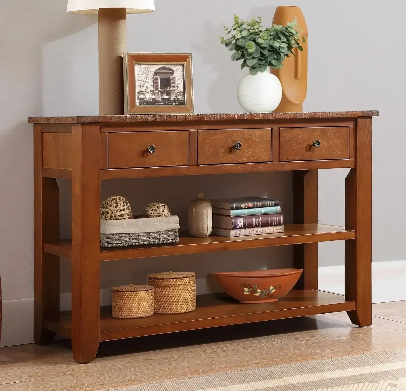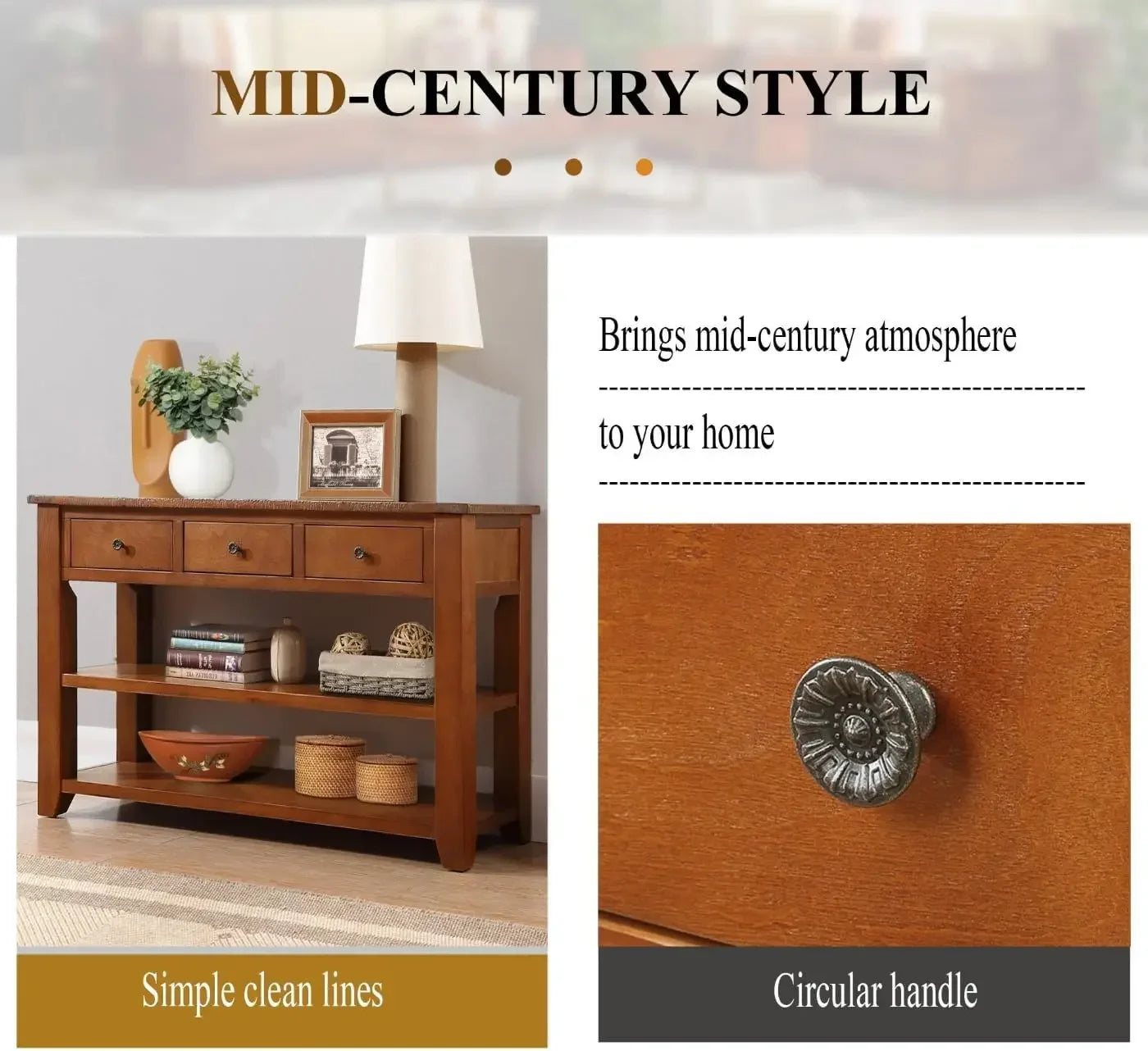 - 【Spacious Storage】This console table features three drawers and two shelves, providing ample storage options. The drawers allow you to organize and store smaller items, while the shelves offer space for displaying decor or storing larger items like books or baskets.
