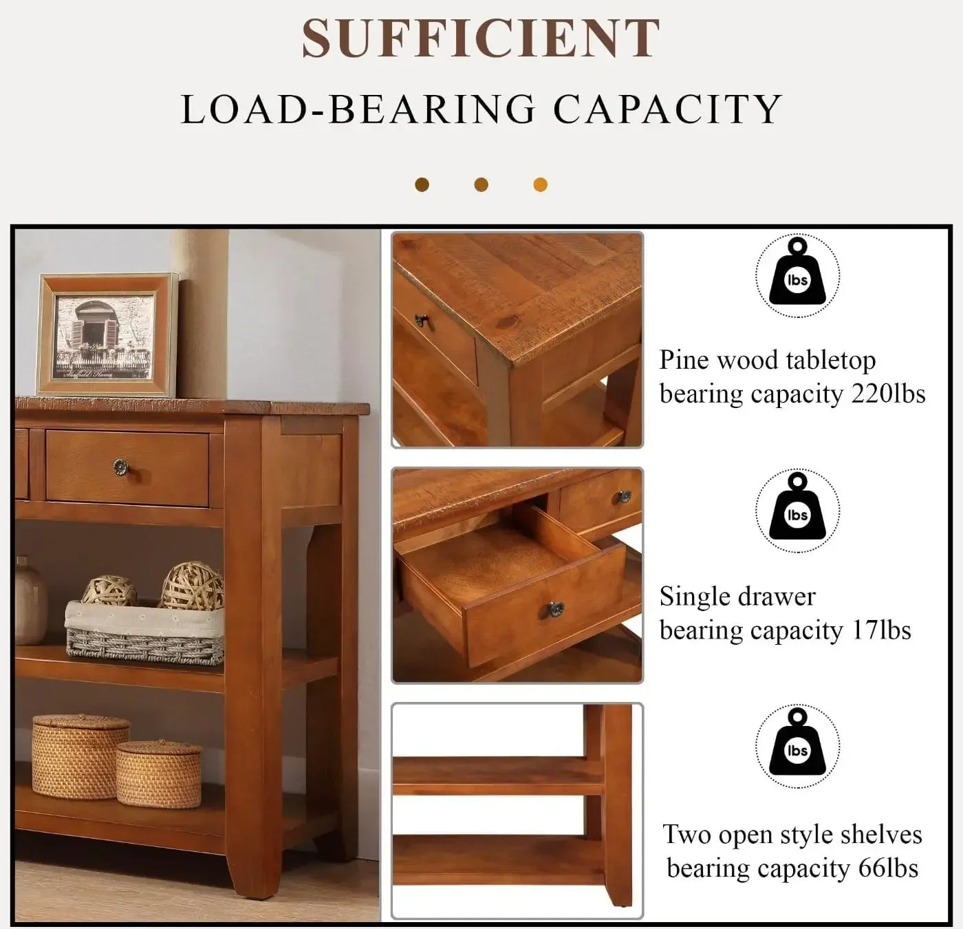 - 【Solid Pine Wood Top】The console table boasts a solid pine wood top, which adds a natural and warm element to the overall design. The sturdy and durable construction ensures long-lasting use and stability.