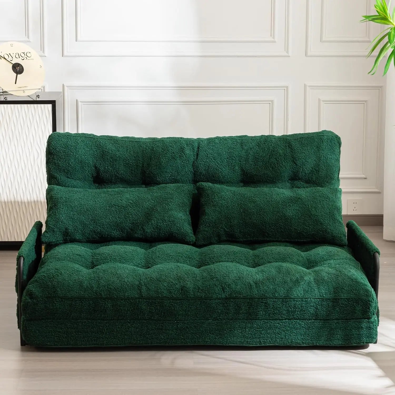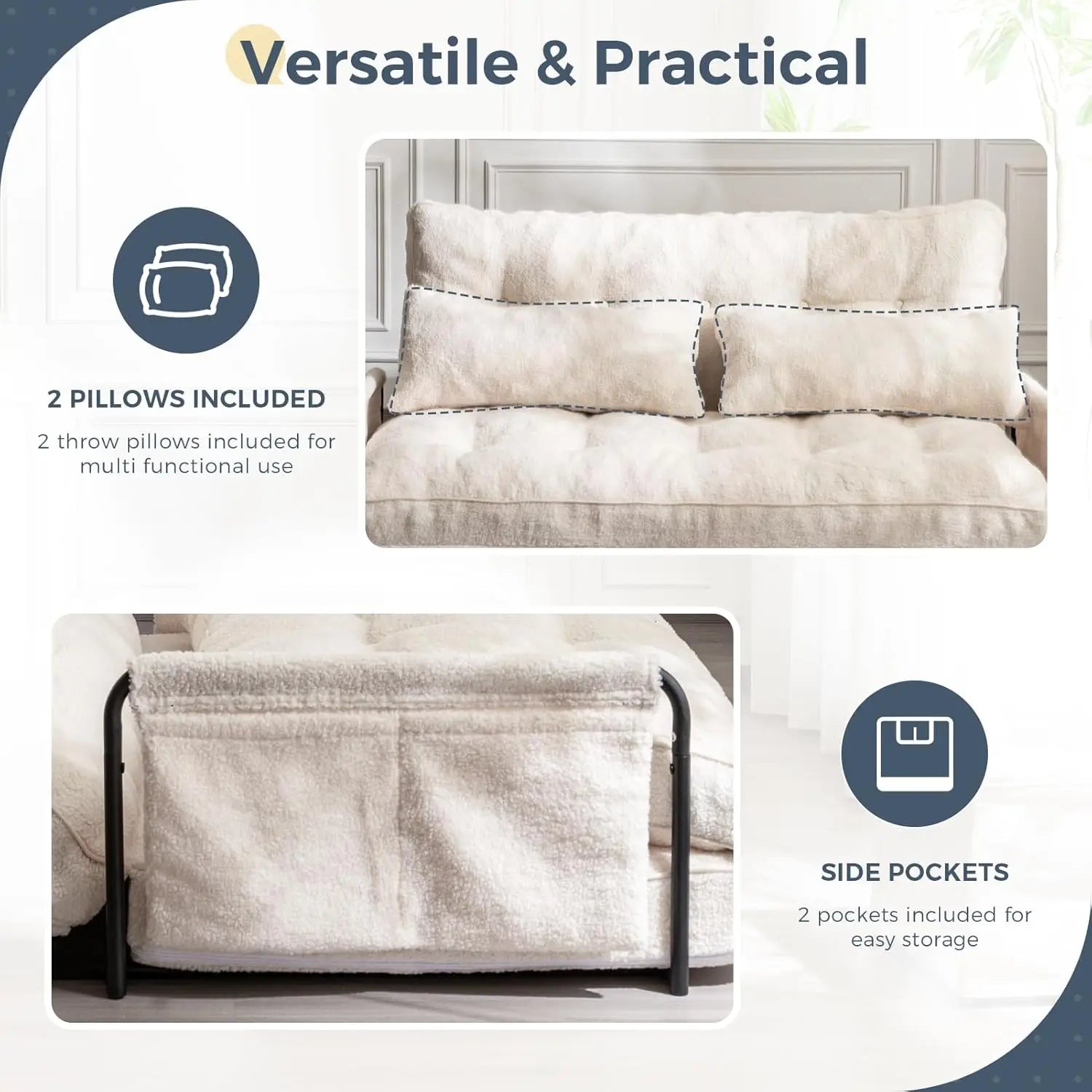 Tufted Craft with Pockets: The sofa bed has an elegant button tufting design that lends it a sophisticated and stylish touch, boosting its overall aesthetic charm. Conveniently, it includes side pockets for storing small essentials such as remote controls and magazines. Additionally, it comes with two coordinating pillows for extra comfort and a stylish finish