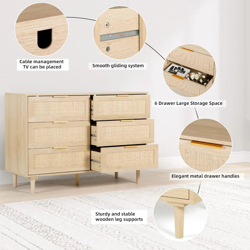 6 Drawer Dresser Rattan Dresser Modern Chest with Drawers,Wood Storage Closet Dressers Chest of Drawers for Bedroom,Living Room,Hallway (Natural)