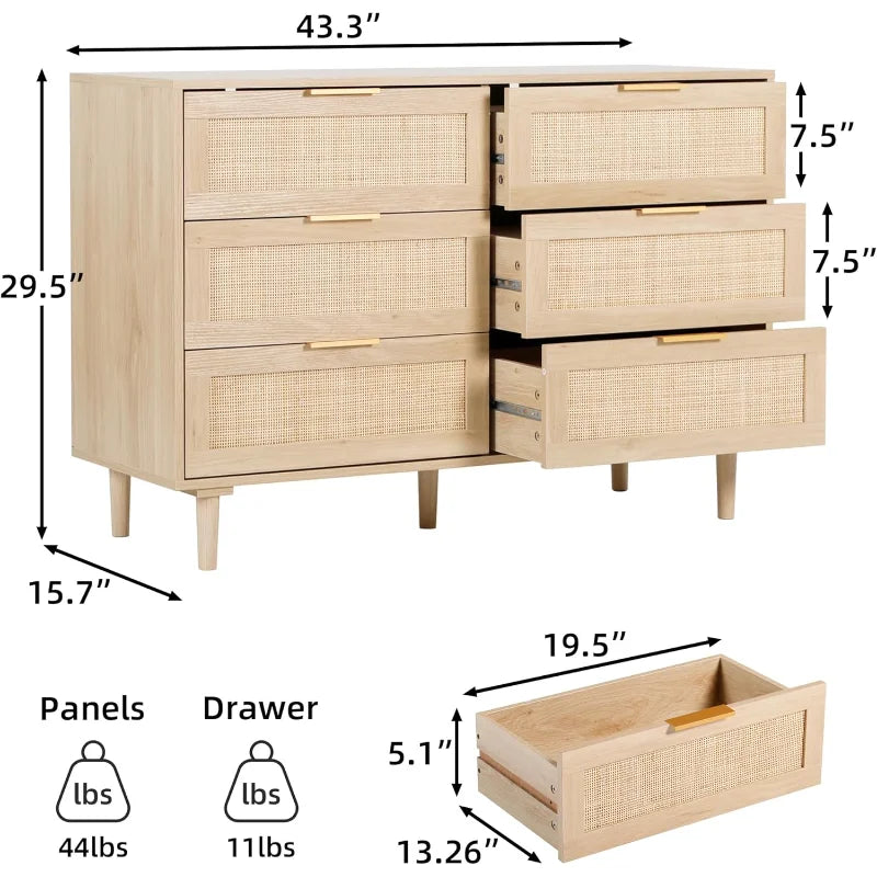 【Clothes Organizer】 Dresser oak size: 43.3 "W x 15.7" D x 29.5" H. Size of each drawer: 19.5 "W x 5.1" D x 10.4" H. With six drawer capacity, it can be used in multiple places, such as living room, bedroom, entrance hall and other occasions where storage is needed. The rattan drawer chest not only helps you organize your room, but also serves as a decoration to make your home more attractive. Provide you with short and exquisite living enjoyment. Such a good product, you deserve to have it.