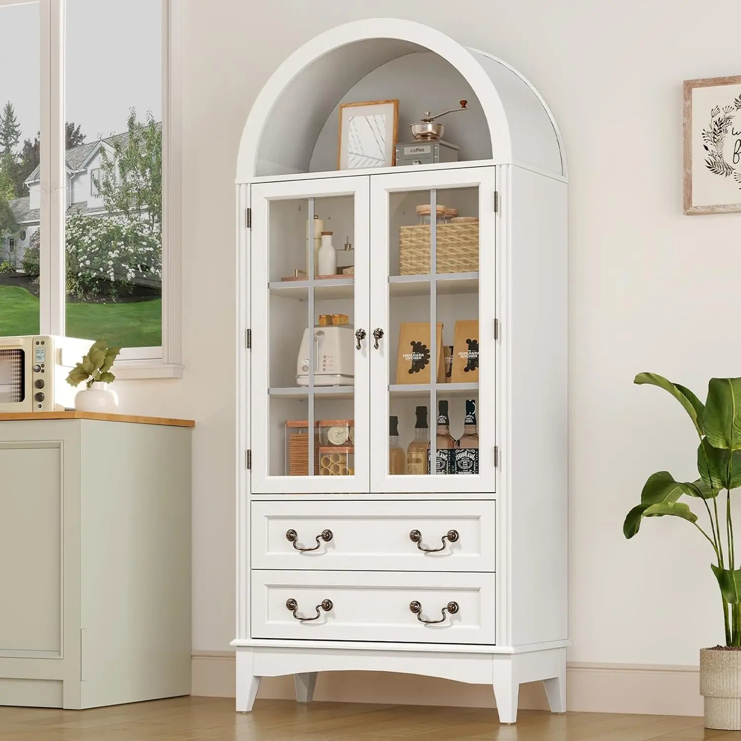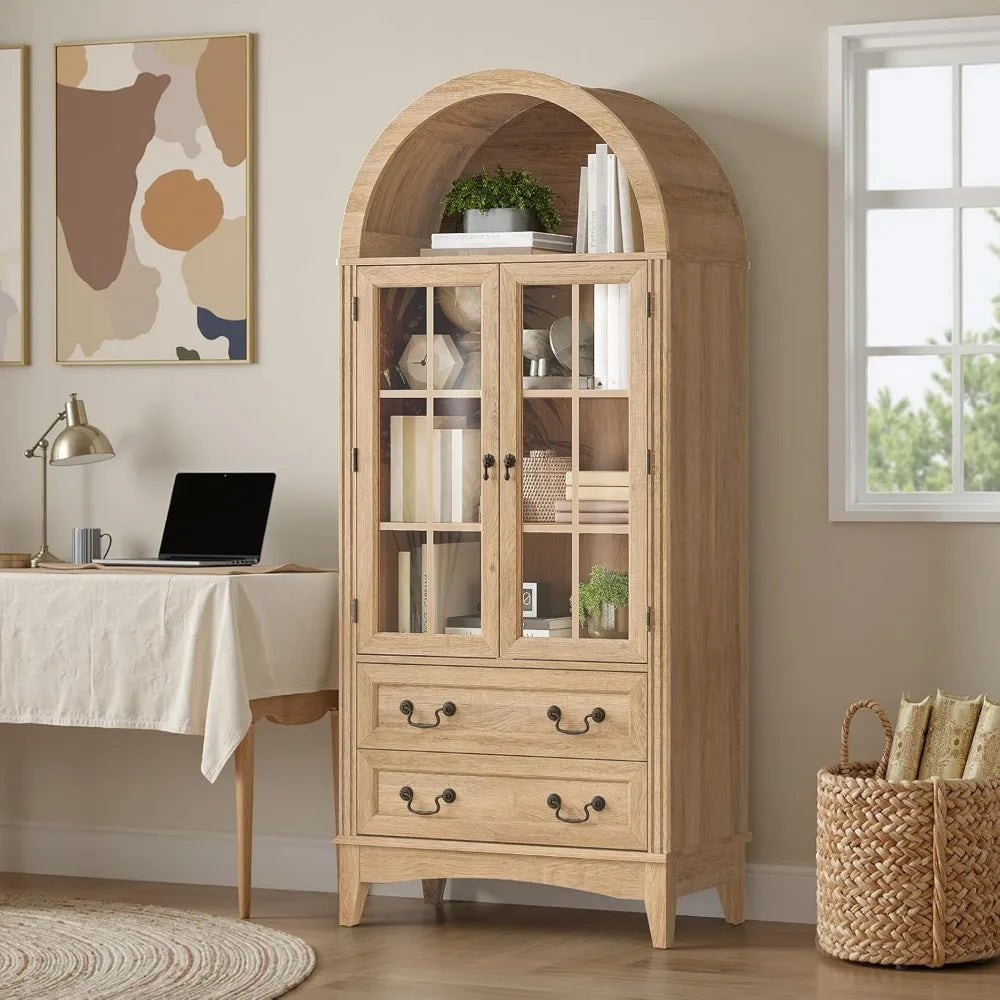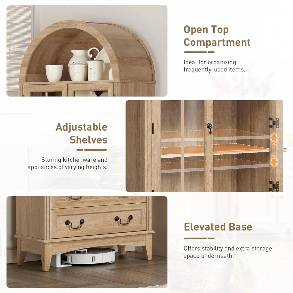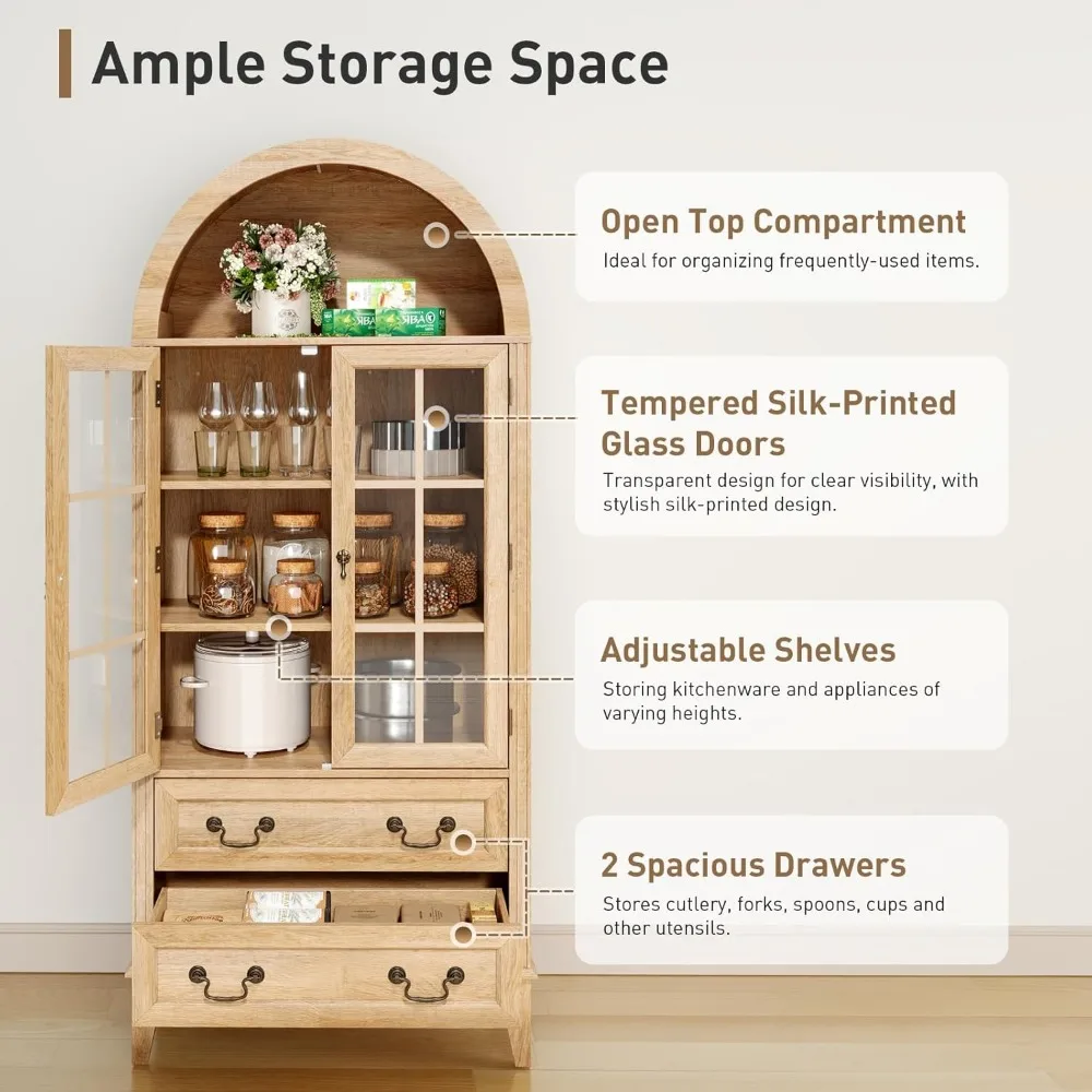 - Ample Storage Space: This storage cabinet features an open arched top area for daily essentials, a glass-door cabinet with 2 adjustable shelves to organize groceries and kitchenware of varying heights, plus 2 spacious drawers ideal for storing tableware and spices