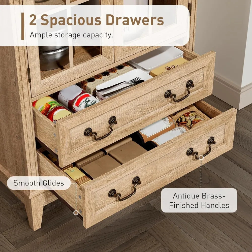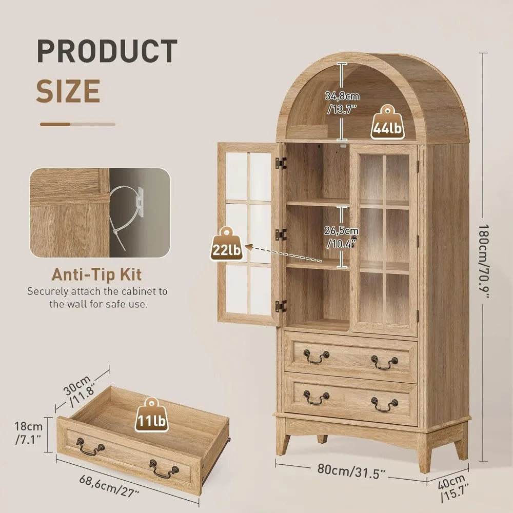 71'' Tall Arched Pantry Cabinet, Farmhouse Kitchen Pantry Cabinet with Glass Doors, Adjustable Shelves and 2 Large Drawers, Vers