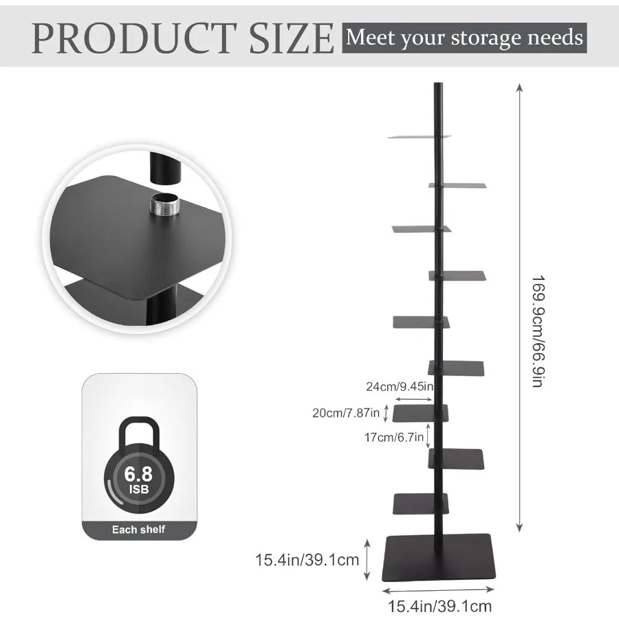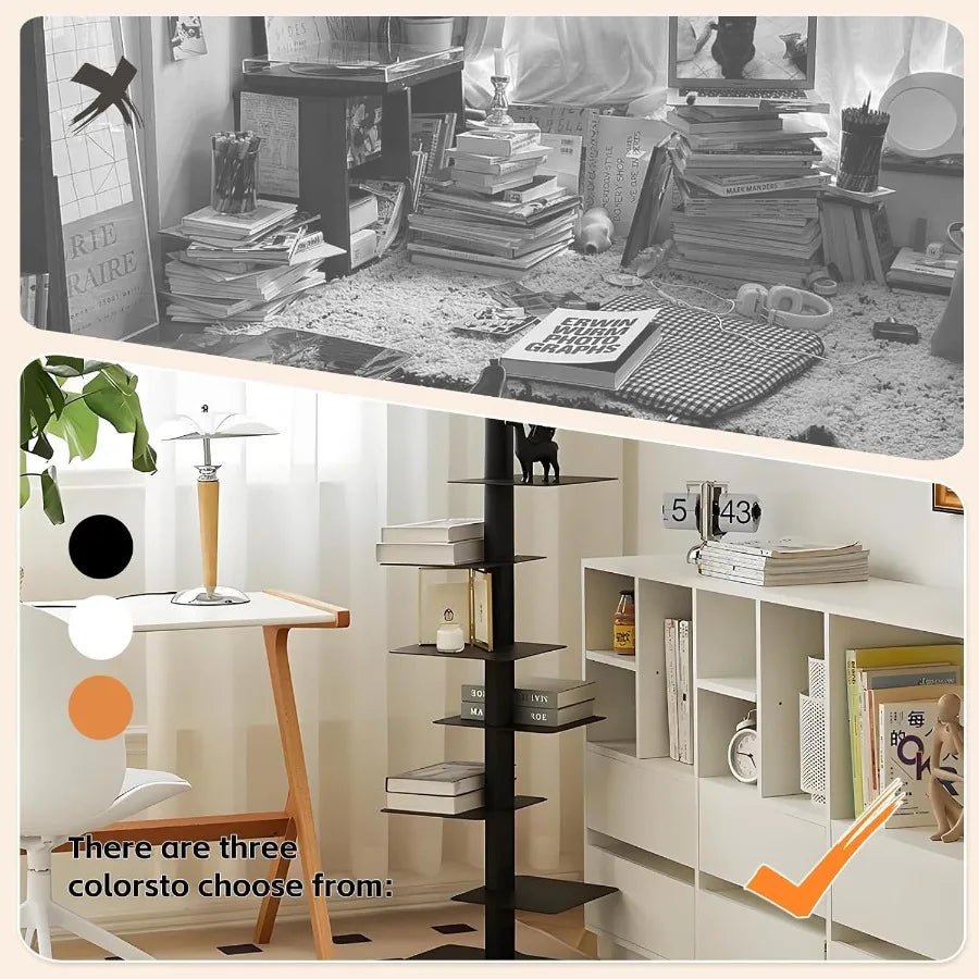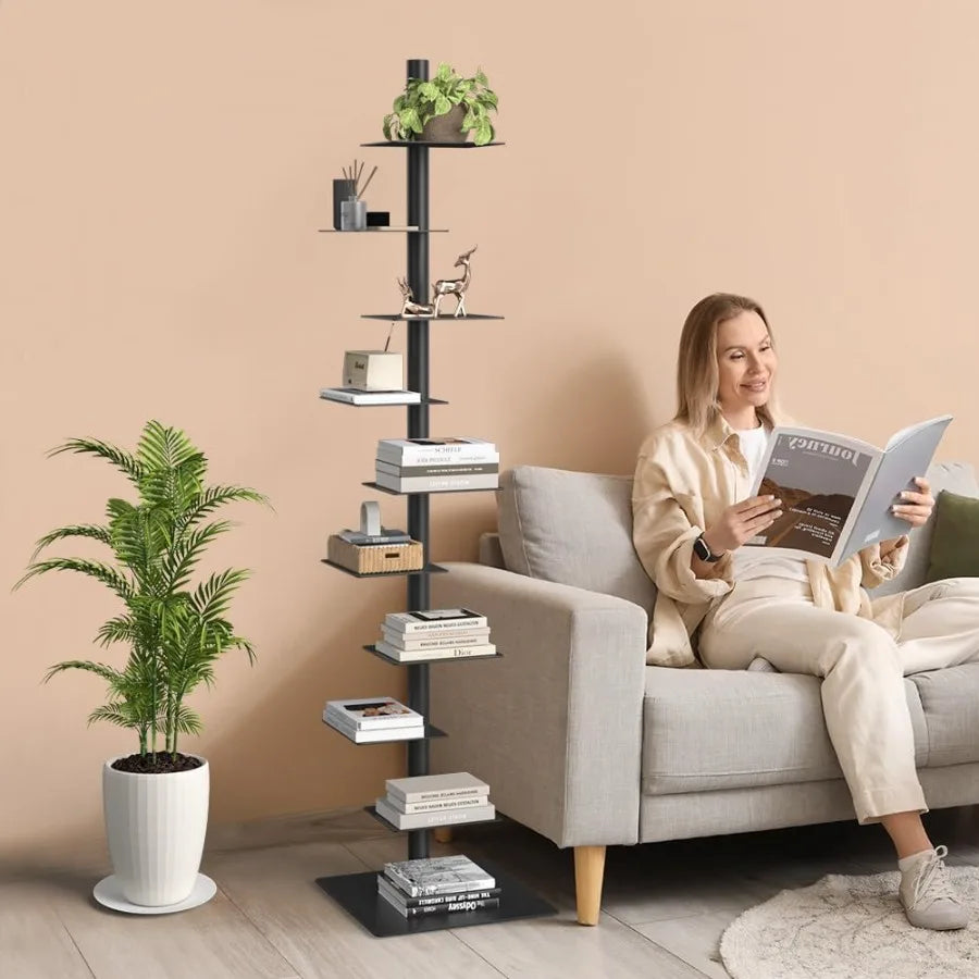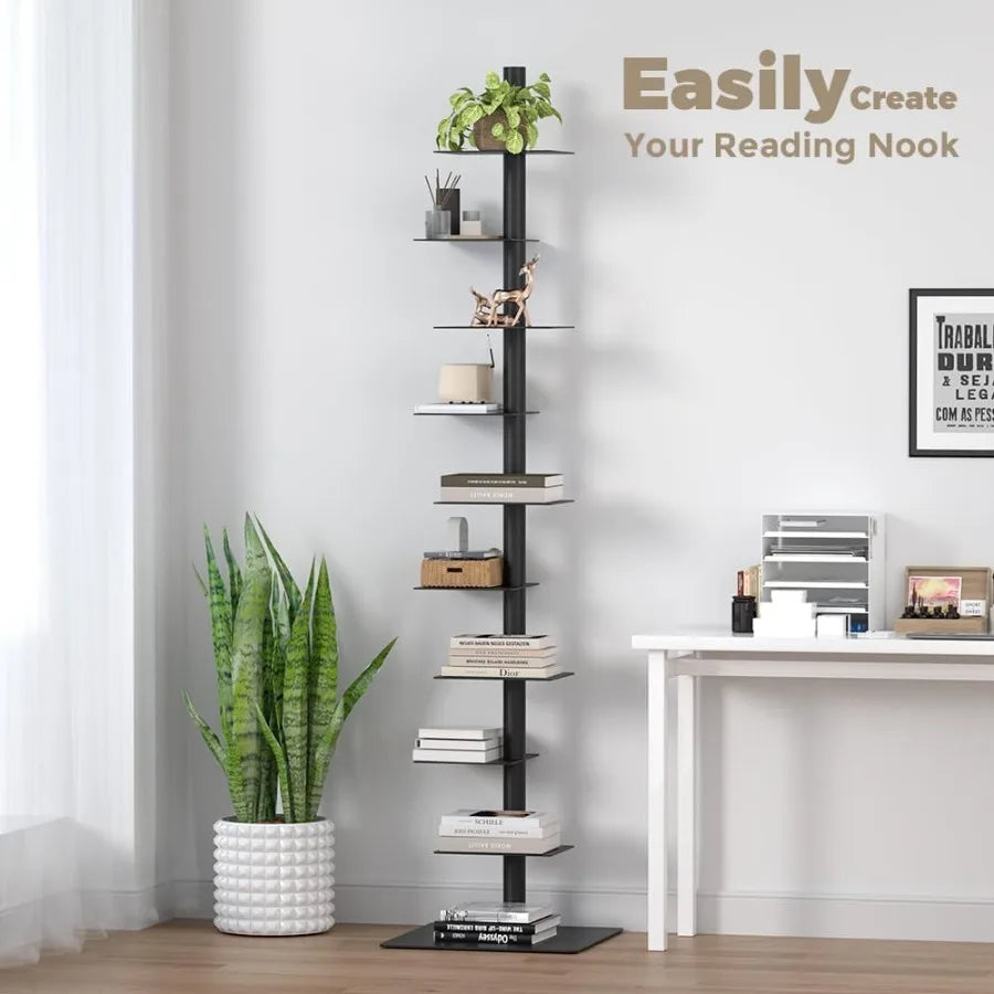 9 Tier Metal Spine Bookshelf Tower Vertical Bookshelf Adjustable Vertical Spine Book Tower Floor Tall Open Shelf 360 Display St