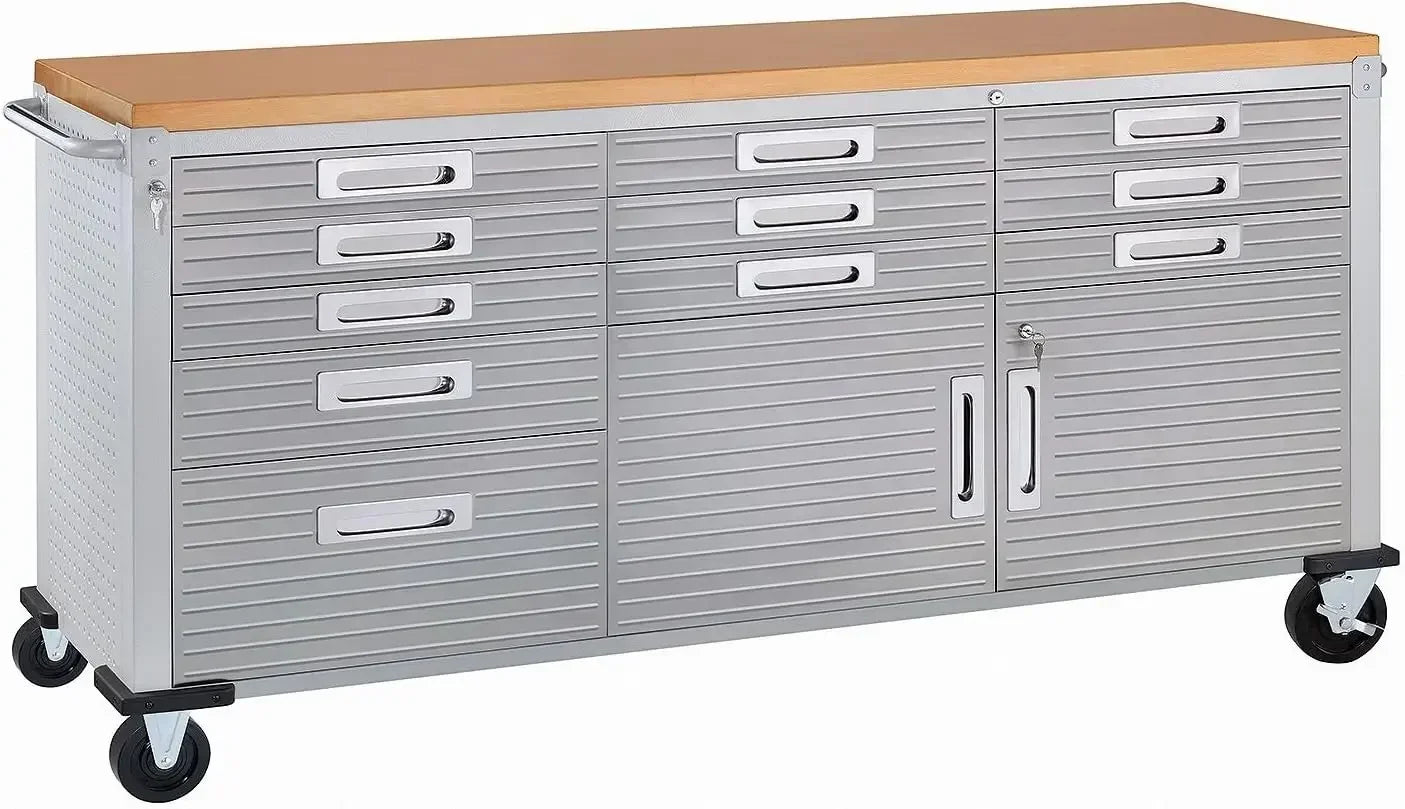 UltraHD Heavy Duty Rolling Cabinet Workbench Table w/Solid Wood Top, Workstation for Garage, Warehouse, Office, Workshop, 77" W x 20" D x 37.5" H, Granite, 11-Drawer