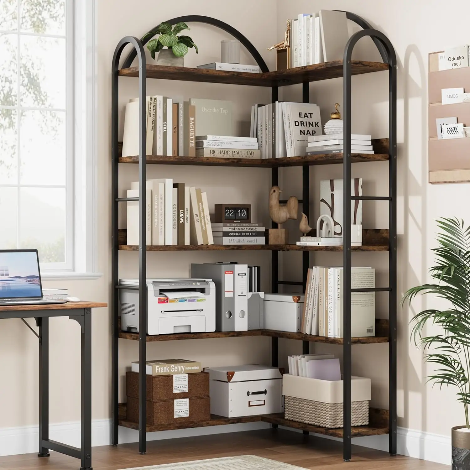 Corner Bookshelf Industrial Bookcase, L Shaped Bookshelf Arched 5 Tier Corner Shelf, Large Bookshelf With Metal Frame