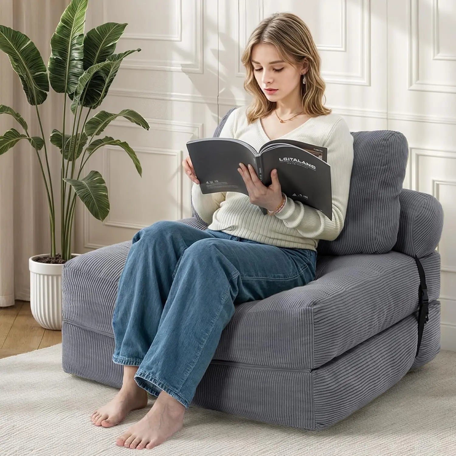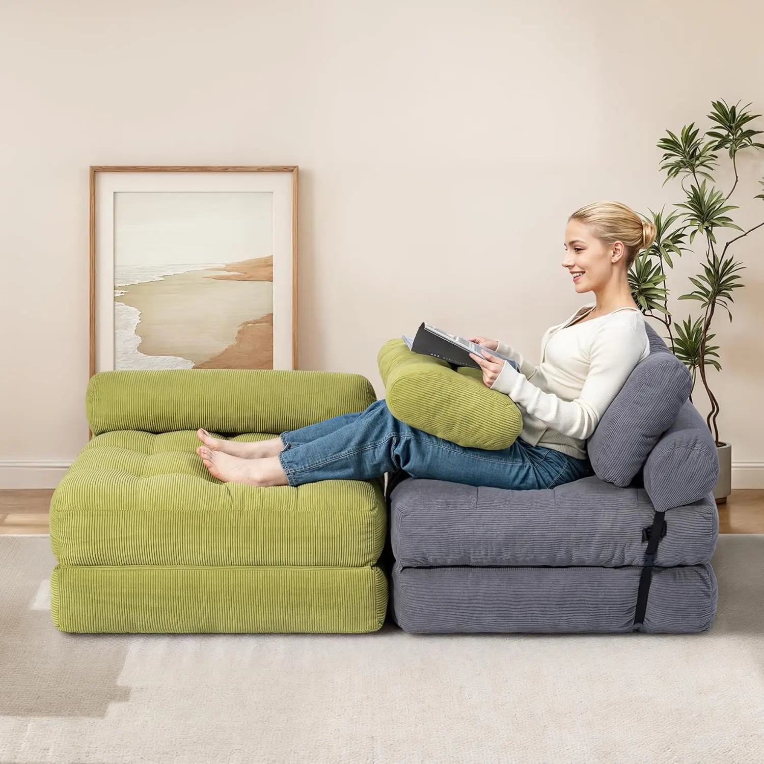 - Durable Fabric - Constructed from high-quality corded fabric, this material provides a unique visual and tactile experience, enhancing the atmosphere of your living space. The folding sofa is approximately 33.5"x33.5"x29.9" in size, When unfolded, the size is 74.8"x33.5"x7.9".designed to offer comfortable seating or sleeping for one person.