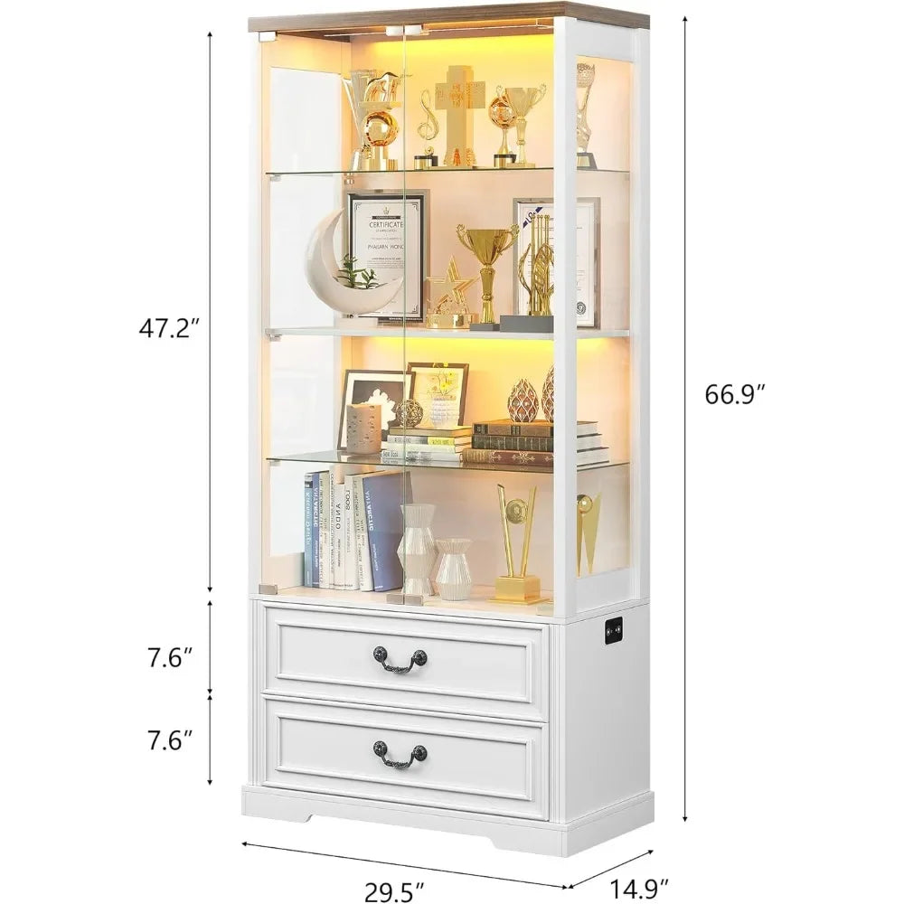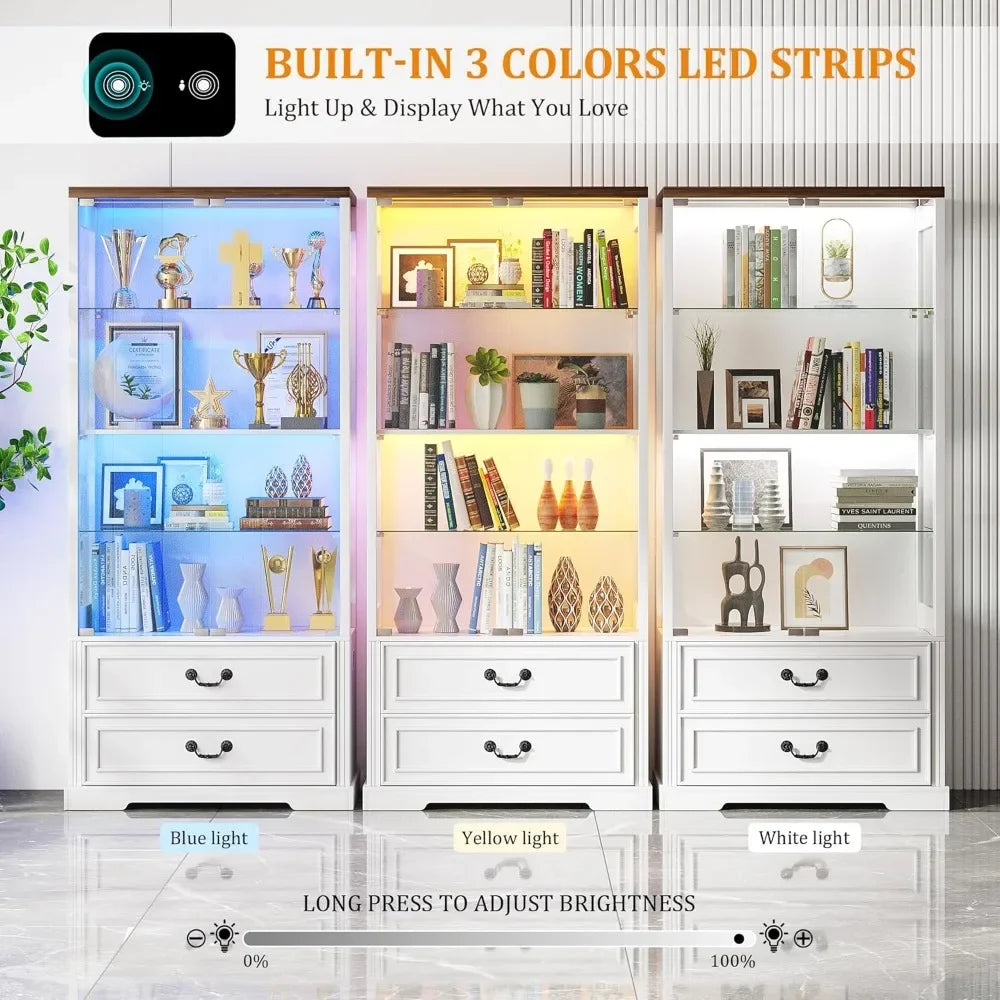[Free Shipping!Hot Deal!]"67-inch tall display cabinet with glass doors, 2 drawers, adjustable shelving, and led-illuminat
