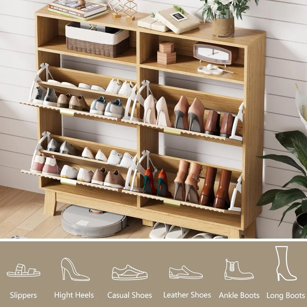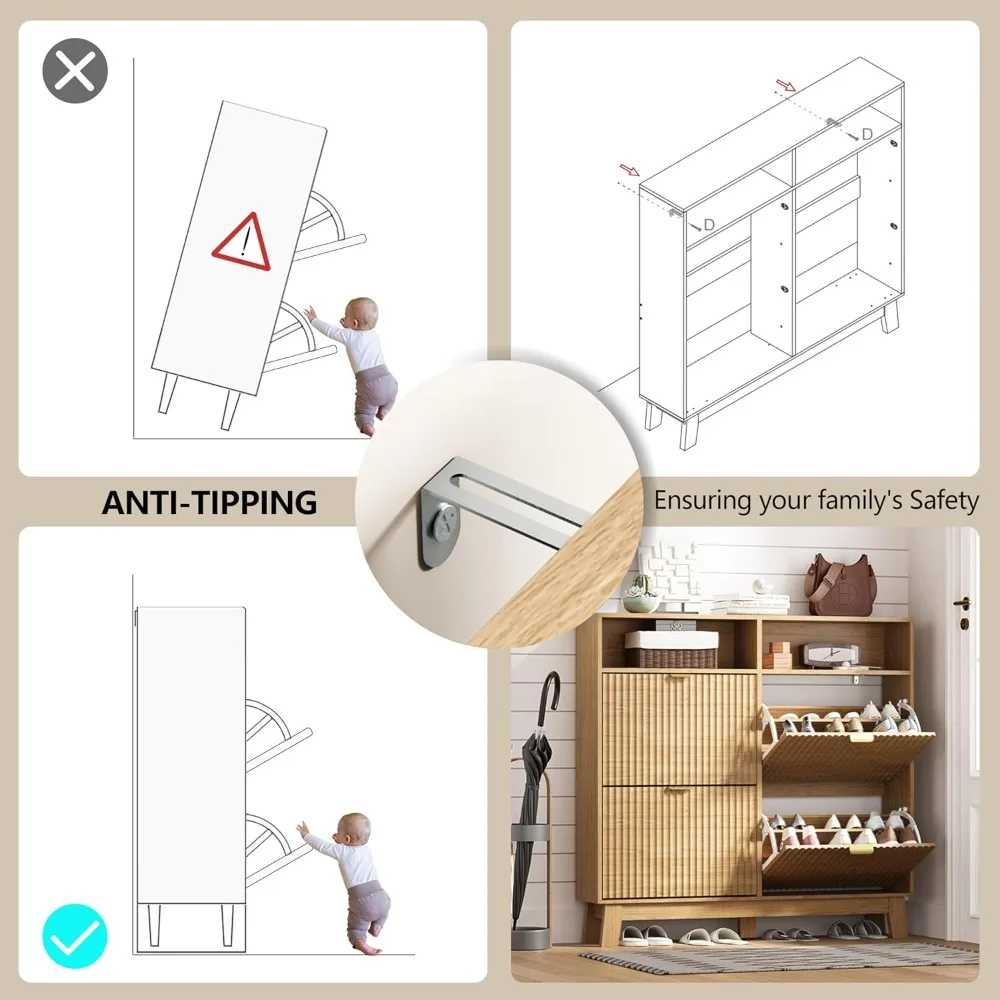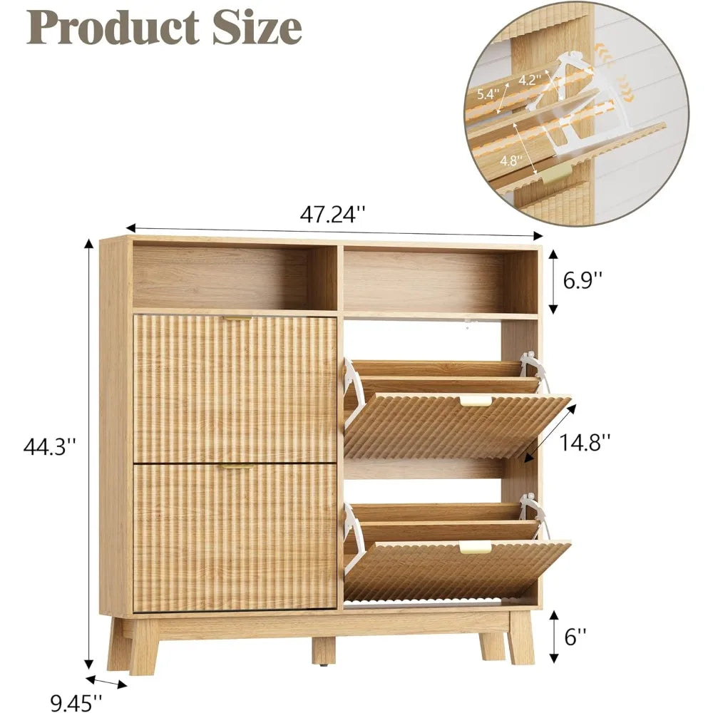 This shoe storage cabinet offers a spacious solution for your footwear needs, measuring 9.5 inches deep by 47.3 inches wide by 45.3 inches high, and is capable of holding shoes up to 13 inches in length. Crafted from engineered wood, it features four flip drawers that can accommodate approximately 25-30 pairs of shoes, making it an ideal choice for small spaces, entryways, and front door entrances. The slim design maximizes storage capacity without taking up too much room, perfect for apartments and dormitories. The shoe organizer boasts a multifunctional design with four flip drawers, each equipped with adjustable shelves that can be easily removed or adjusted to fit various shoe heights and sizes. The cabinet also includes a spacious open desktop, providing extra space for items such as keys, wallets, picture frames, and plants, helping to keep your entryway tidy and aesthetically pleasing. The cabinet's fluted flip drawers are a unique design feature that not only saves space but also keeps shoes out of sight, offering a functional and mid-century modern appeal. The narrow design creates subtle shadow effects that add dimension to your hallway, setting it apart from standard shoe racks and providing a neat and organized look. Safety and reliability are key features of this shoe storage solution, with anti-tipping devices and a ventilated back that secure the organizer to the wall, preventing accidental tipping or shaking. The sturdy wooden legs offer strong support, ensuring the shoe dresser can withstand daily use over the years. This freestanding shoe organizer combines functionality with an aesthetically pleasing design, maintaining a slim profile while complementing farmhouse or mid-century home decor. It is perfect for maximizing storage and can accommodate a variety of shoe types, including low boots, high heels, leather shoes, flats, sandals, and casual shoes. The shoe storage cabinet comes with detailed instructions and all required components labeled for easy assembly, ensuring a smooth and efficient process. A professional online customer service team is available for any post-purchase assistance, and if you have any questions or need replacements, feel free to contact us directly for a quick resolution.