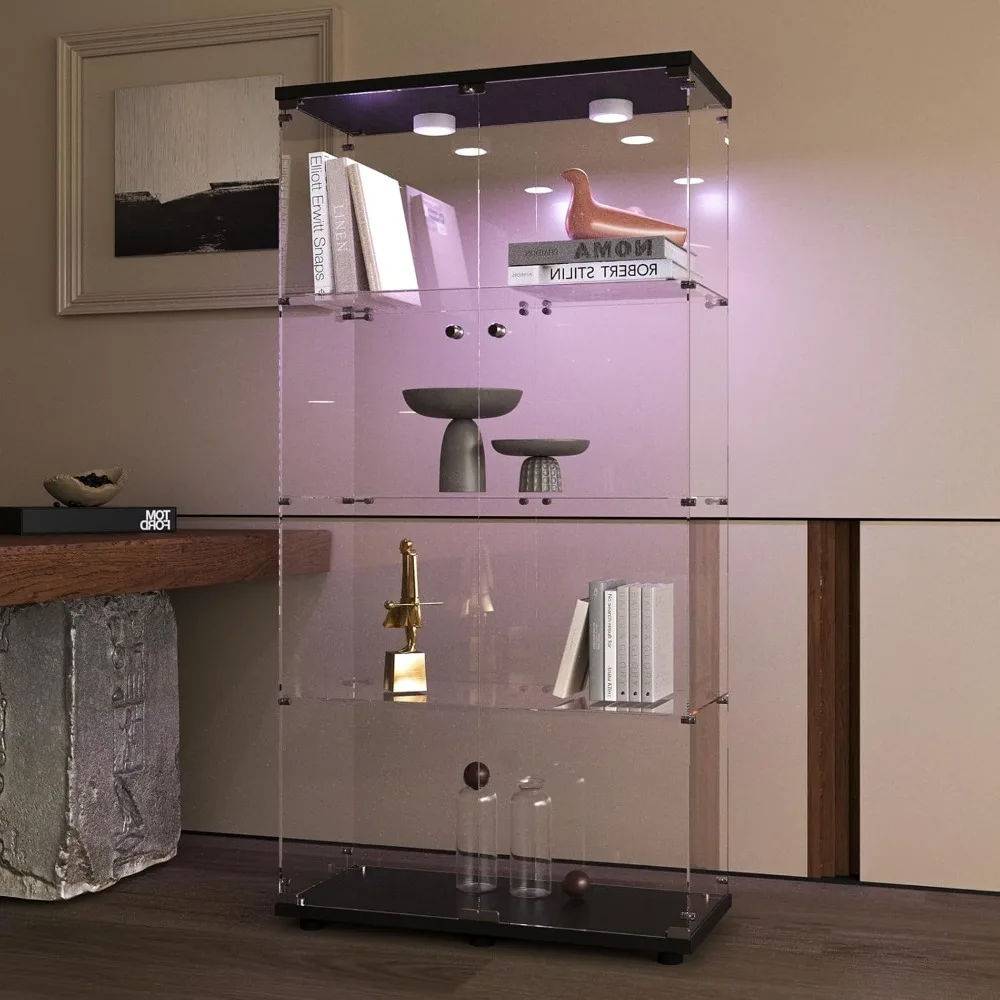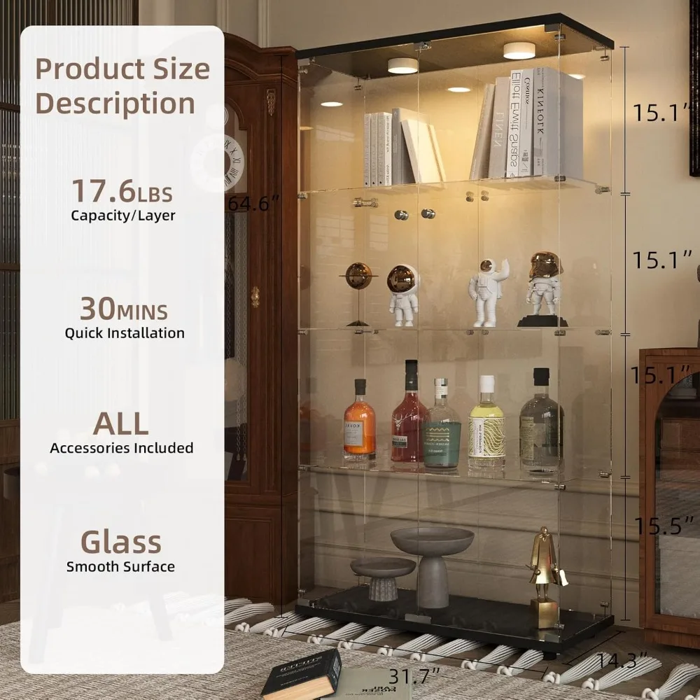 - Sleek Design: The Glass Display Cabinet features a sleek and modern design that will enhance the aesthetic of any living room, bedroom, or office. The double-door, four-shelf layout provides ample space to showcase your favorite items, while the black finish adds a touch of sophistication