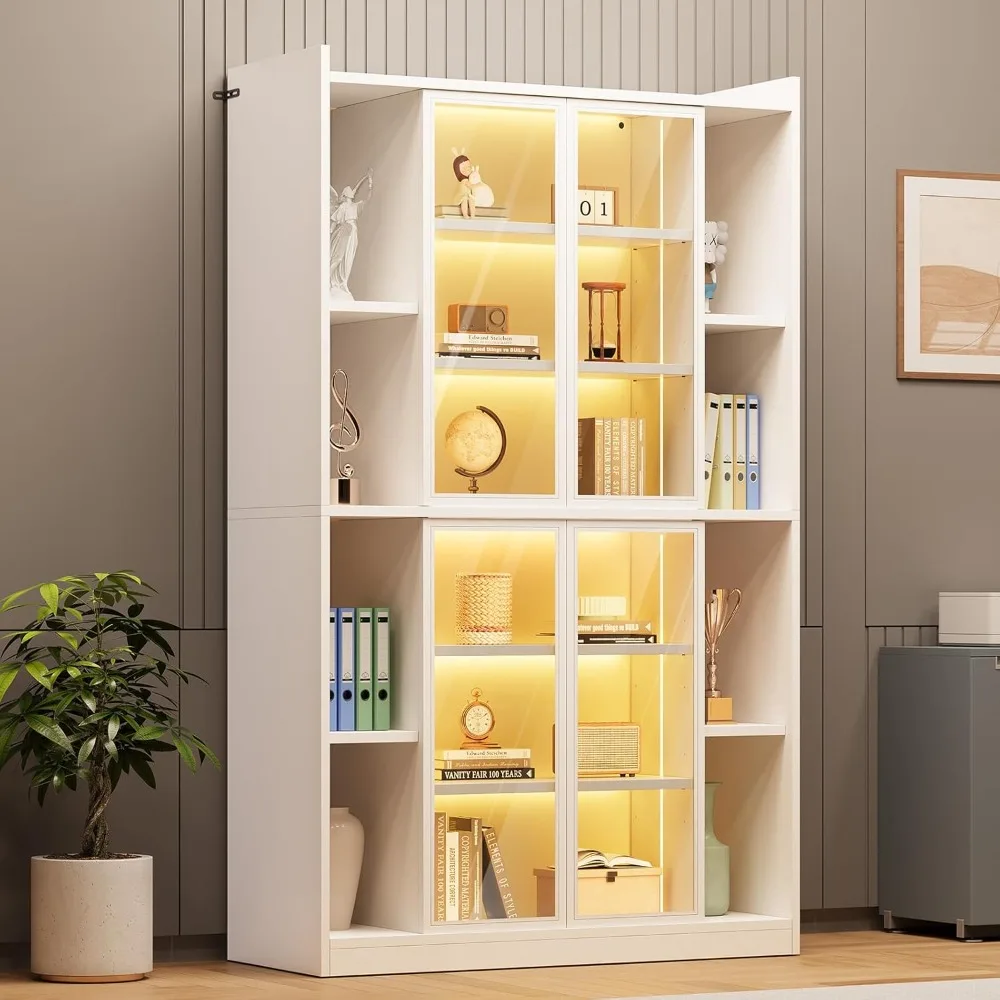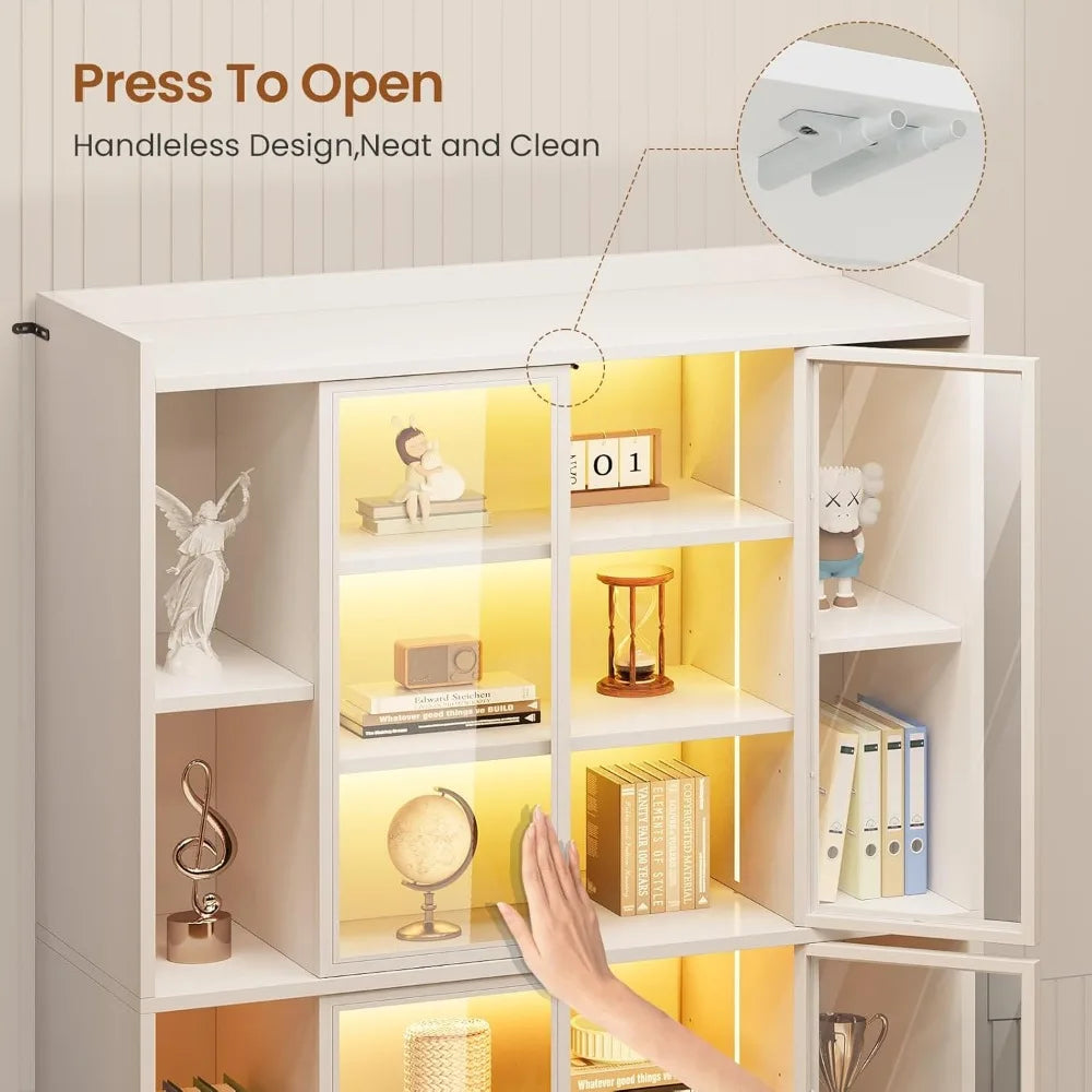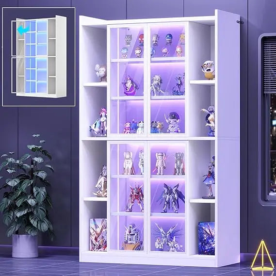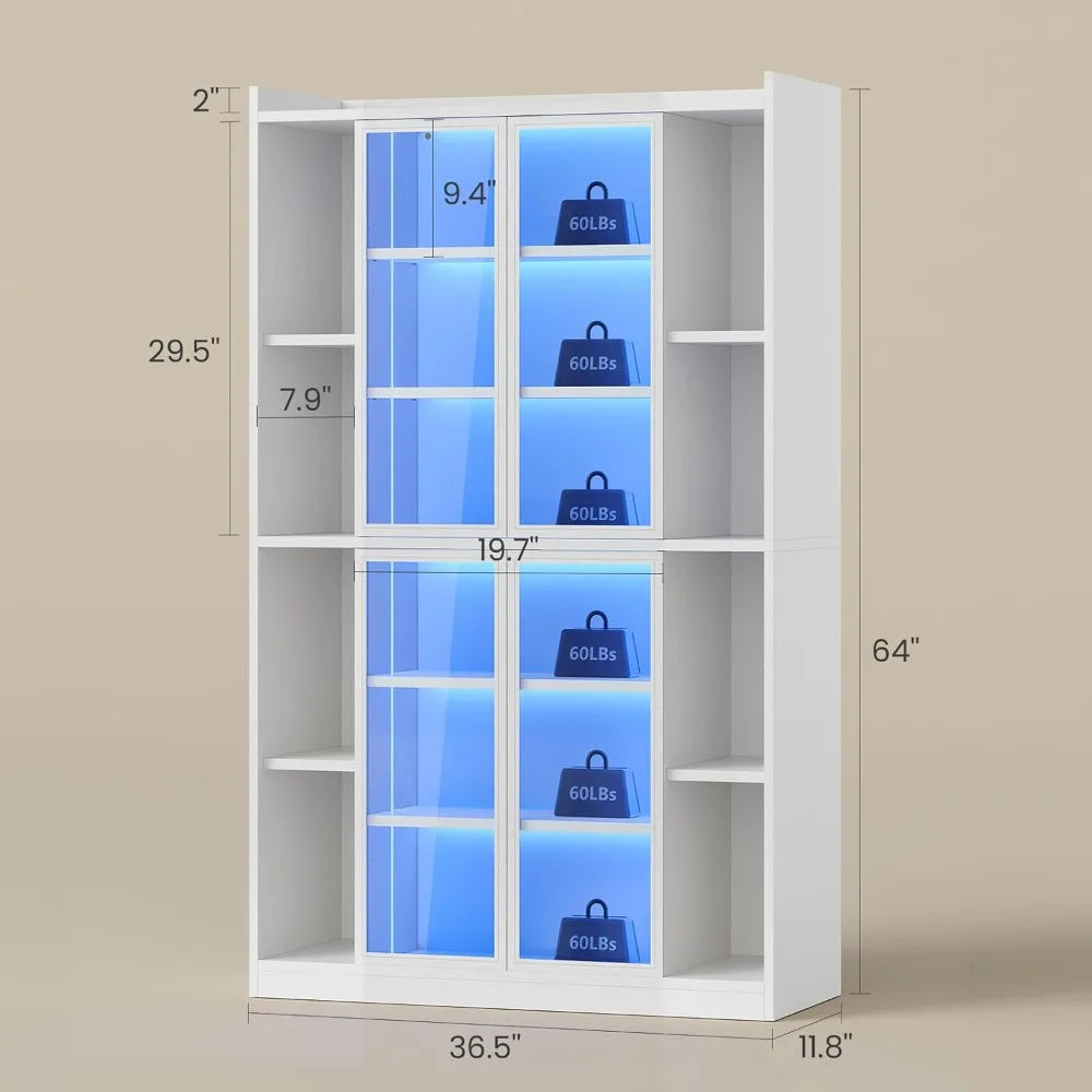 This glass display cabinet features RGB LED lighting that can be controlled remotely through an app, offering over 60,000 color options and 29 different flashing modes. The lights also have a music sync function, with a built-in microphone that adjusts sensitivity, allowing the LED color to change in rhythm with sound and music. The cabinet's LED lights can be customized to match various scenes. The cabinet provides ample storage with six shelves, and the spacious area is designed for organized storage of various items. The door includes four adjustable shelves that can be moved up and down to accommodate items of different sizes. Suitable for organizing books, displaying toys, or storing food, the bookcase's frame and shelves are crafted from FSC-certified wood. Versatile for multiple settings, this LED-lit bookshelf display cabinet can be used as a bookshelf in the study, a display for collections in the living room, or for storing bags in the bedroom. The LED lighting enhances the atmosphere in various ways. The cabinet boasts a modern design with a transparent acrylic door that opens and closes with a simple press, providing a clear view of the contents inside. This design seamlessly fits into any home decor, helping to keep the room tidy and aesthetically pleasing. Assembly is straightforward with clear instructions and numbered parts. Should your display cabinet arrive damaged, scratched, or with missing parts, contact us for a free replacement or partial refund.