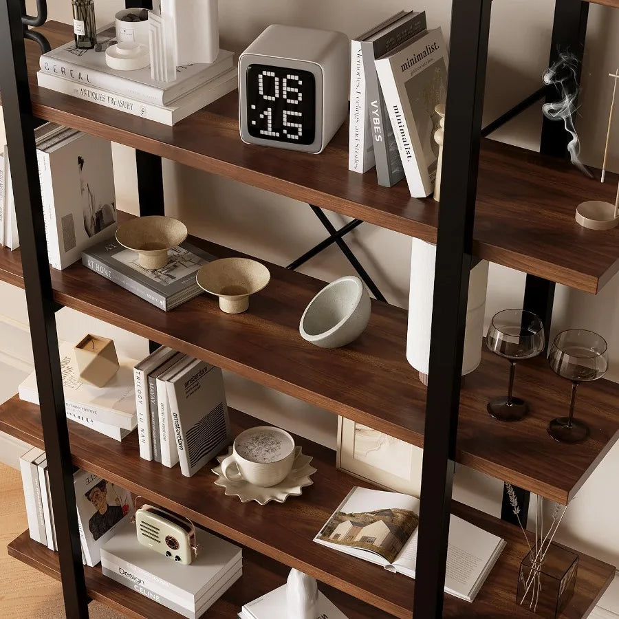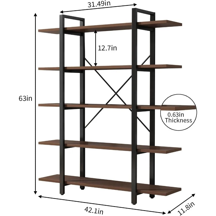 Industrial Bookshelf with 5 Shelves Solid Wood core Bookcase Walnut Wood and Black Metal Frame Large Open Storage Display Unit
