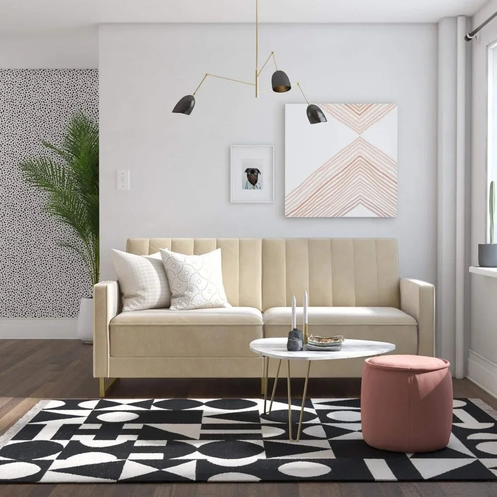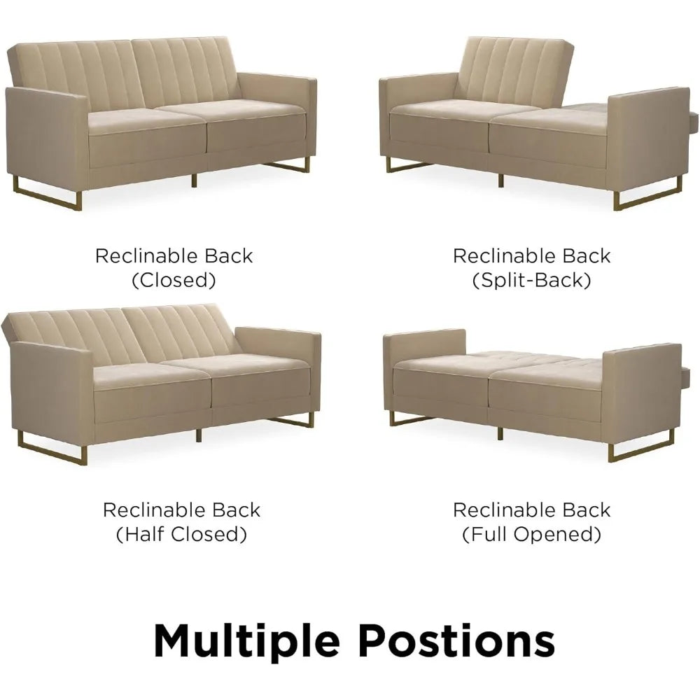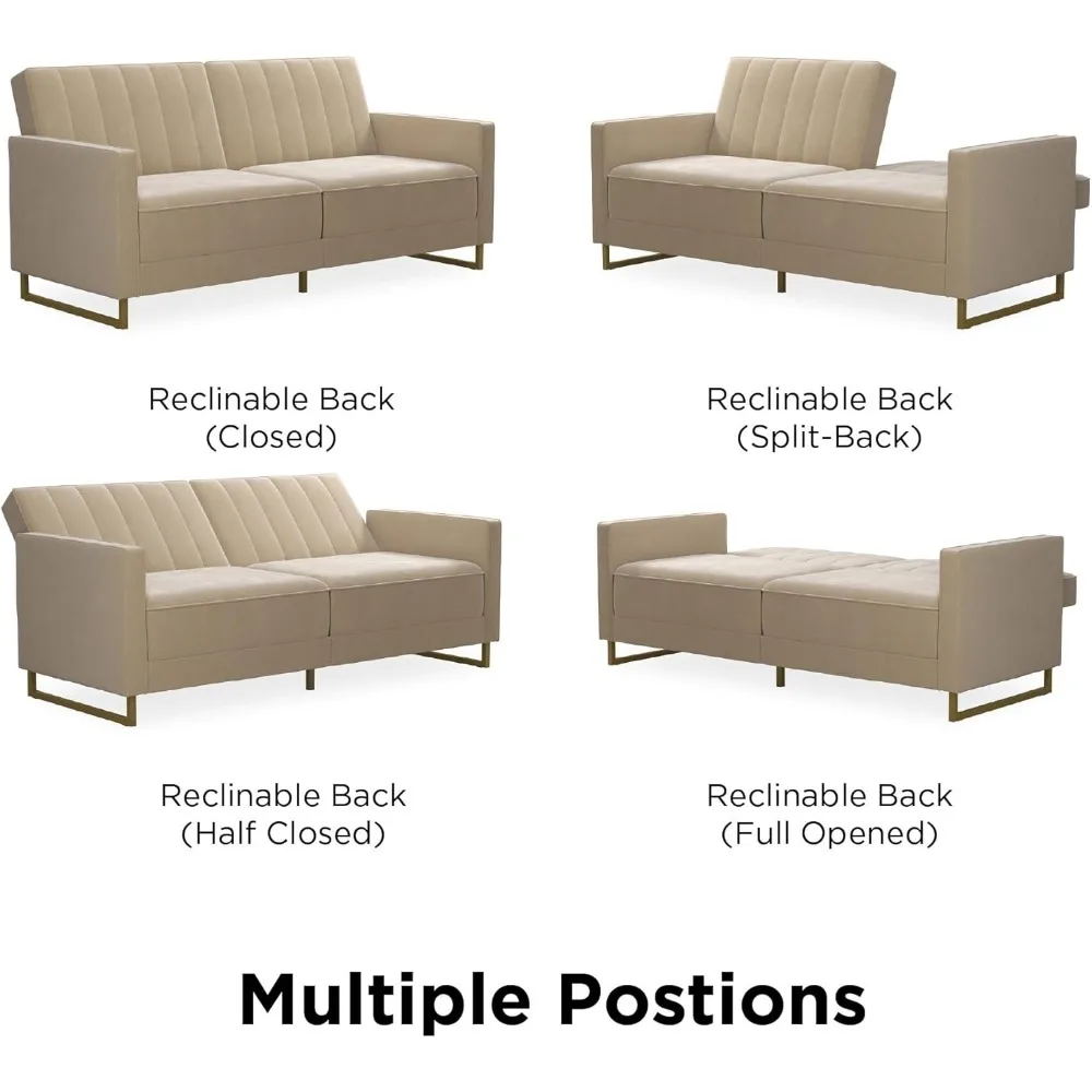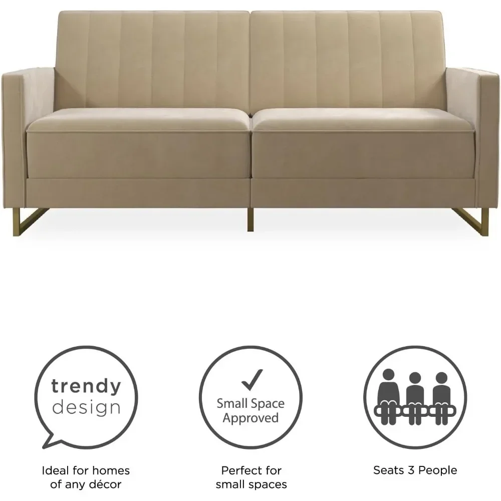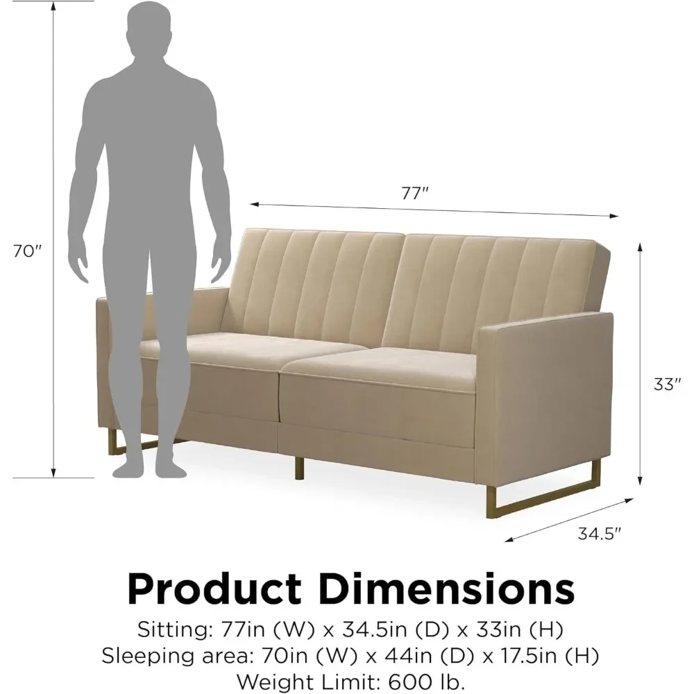 This product features a contemporary design with plush velvet fabric and tufted cushions, offering a chic aesthetic for your bedroom. The futon can also function as a small sofa. The Skylar futon sofa bed boasts pocket coil seating for enhanced comfort, making it perfect for movie nights or accommodating overnight guests. Its split-back design enables the futon to be adjusted into various positions, from sitting to lounging to sleeping, providing versatility as a sofa sleeper. Assembly is a breeze with this compact sofa couch, which arrives in a single box. The sofa bed is adorned with gold powder-coated metal legs that not only add a modern touch but also support up to 600 lbs.
