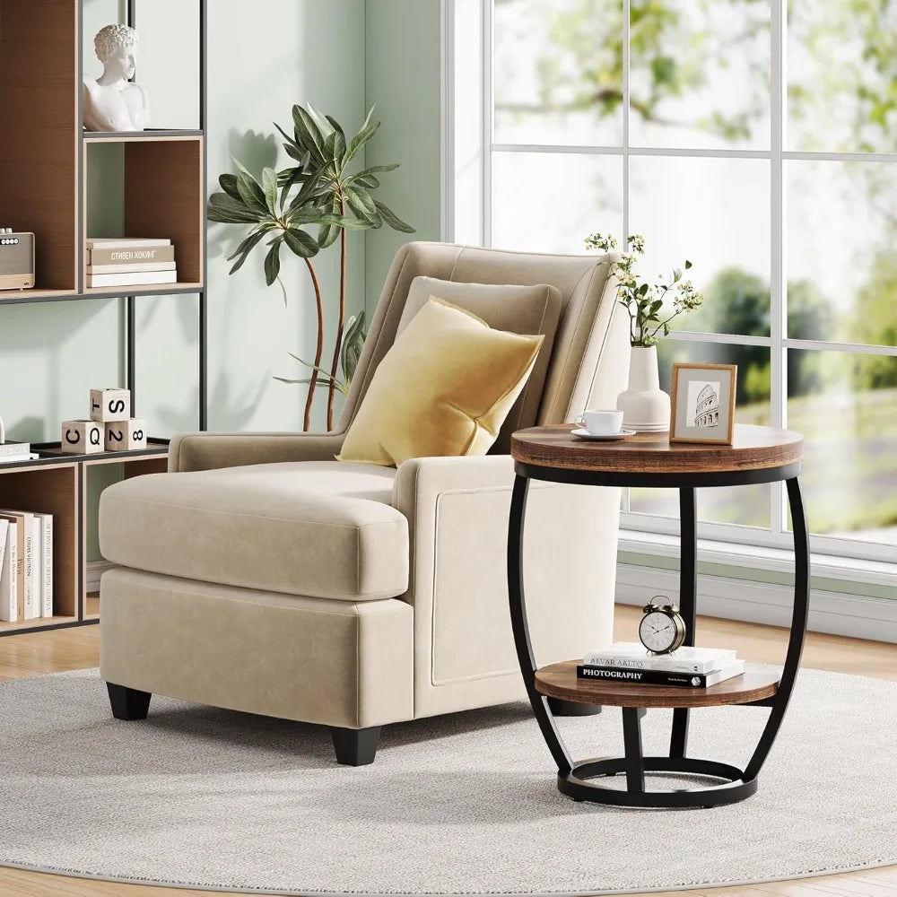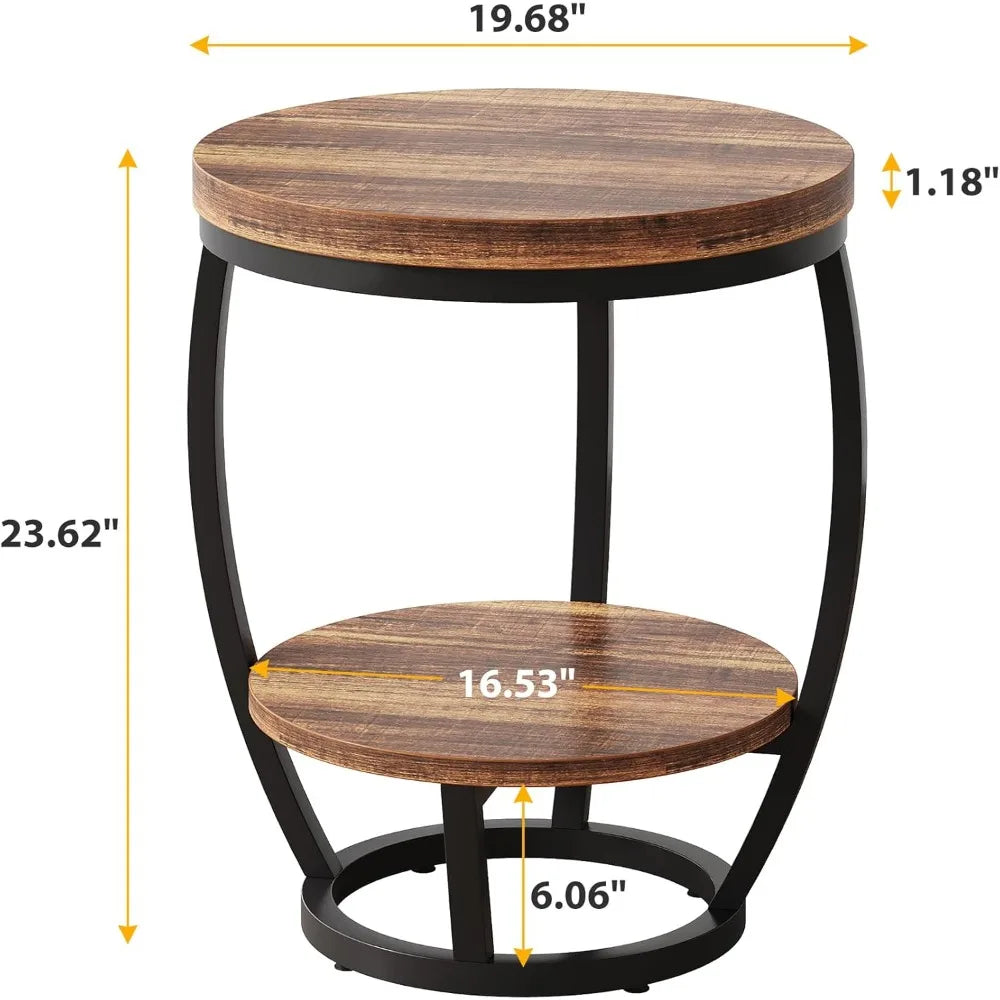Round End Table, 2 Tier Industrial Side Table, Nightstand with Metal Frame, Accent Bedside Table with Storage Shelves for Living