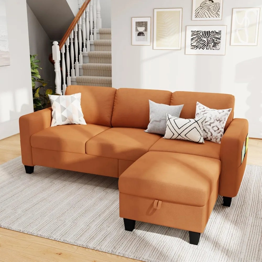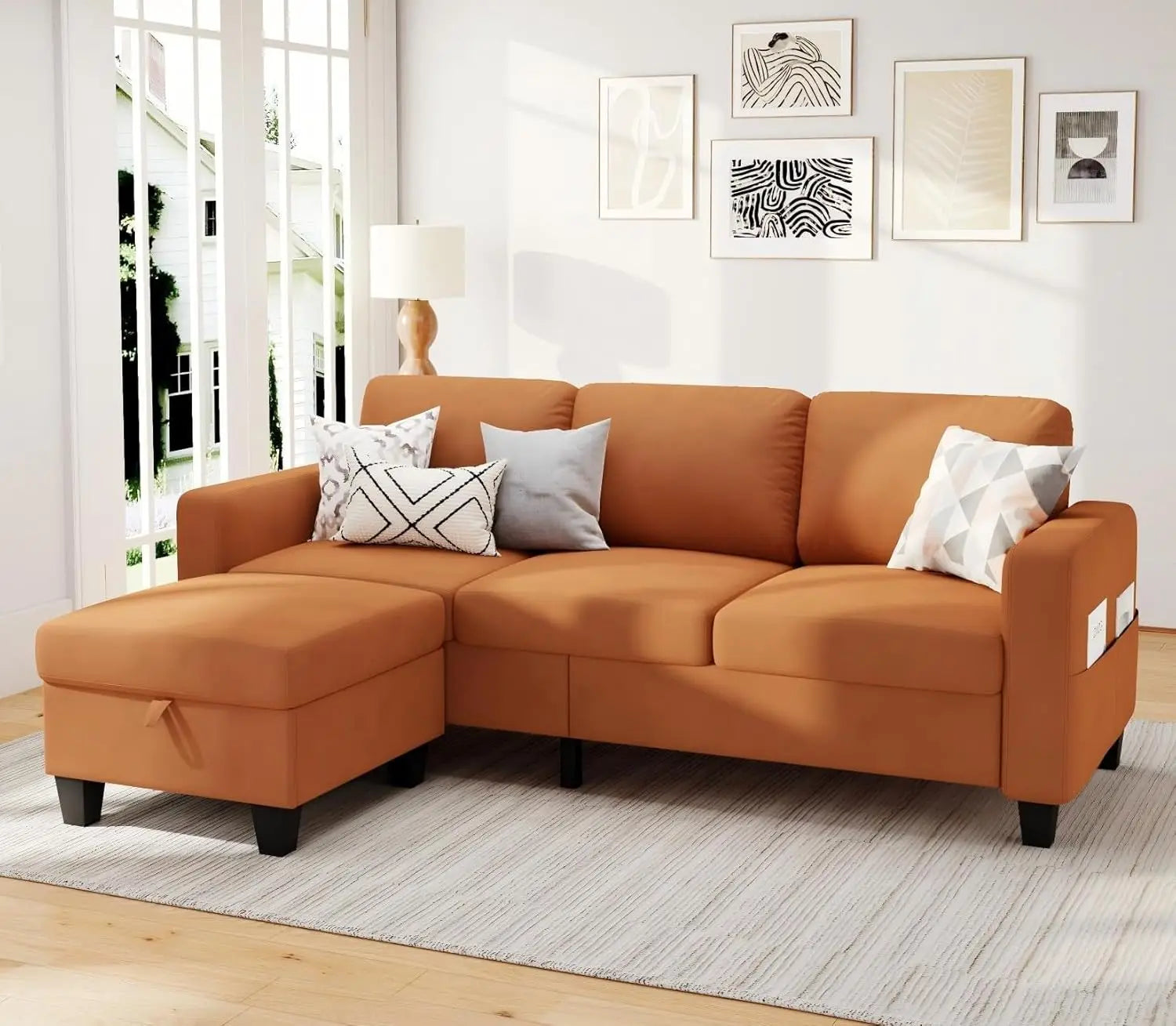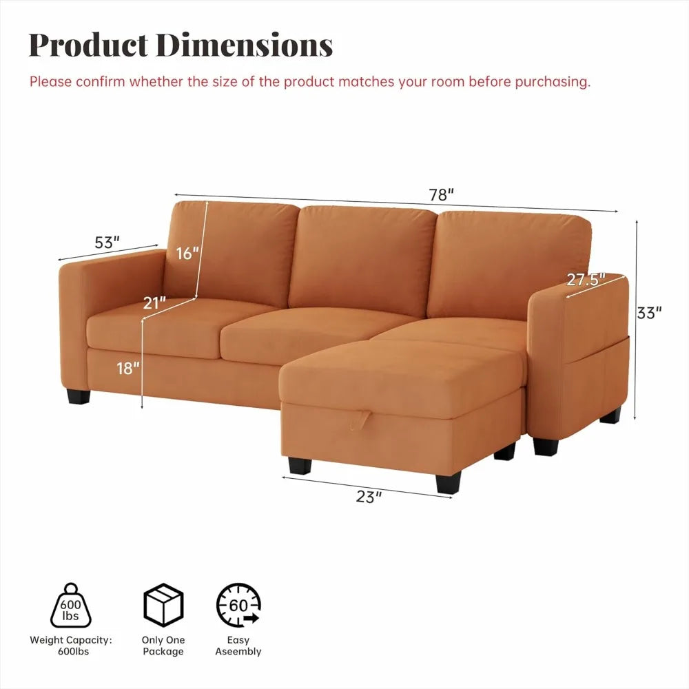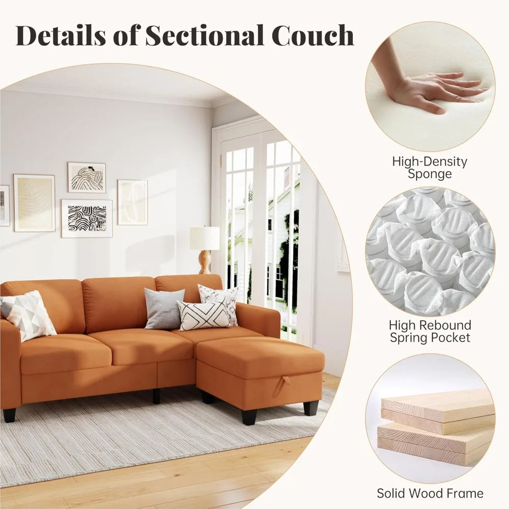 Sectional Sofas Couches for Living Room 3 Seater L Shaped Couch with Storage Ottoman 78" Modern Velvet Fabric Orange Sofa