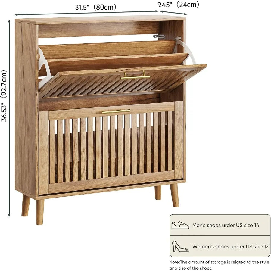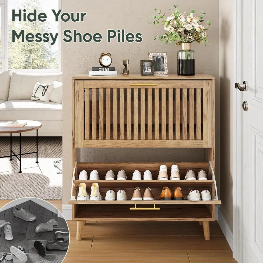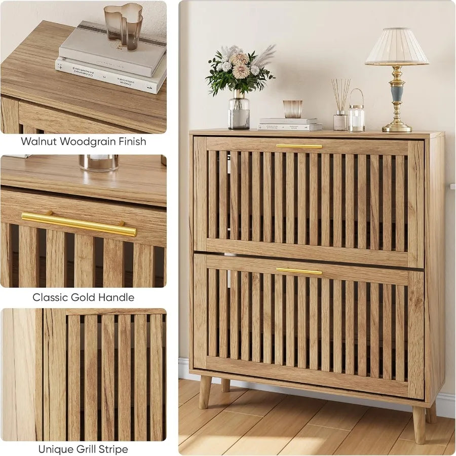 Shoe Storage Cabinet with 2 Flip Louvered Drawers Narrow Wood Shoe Cabinet with Gold Handle Hidden Entryway Shoe Organizer for