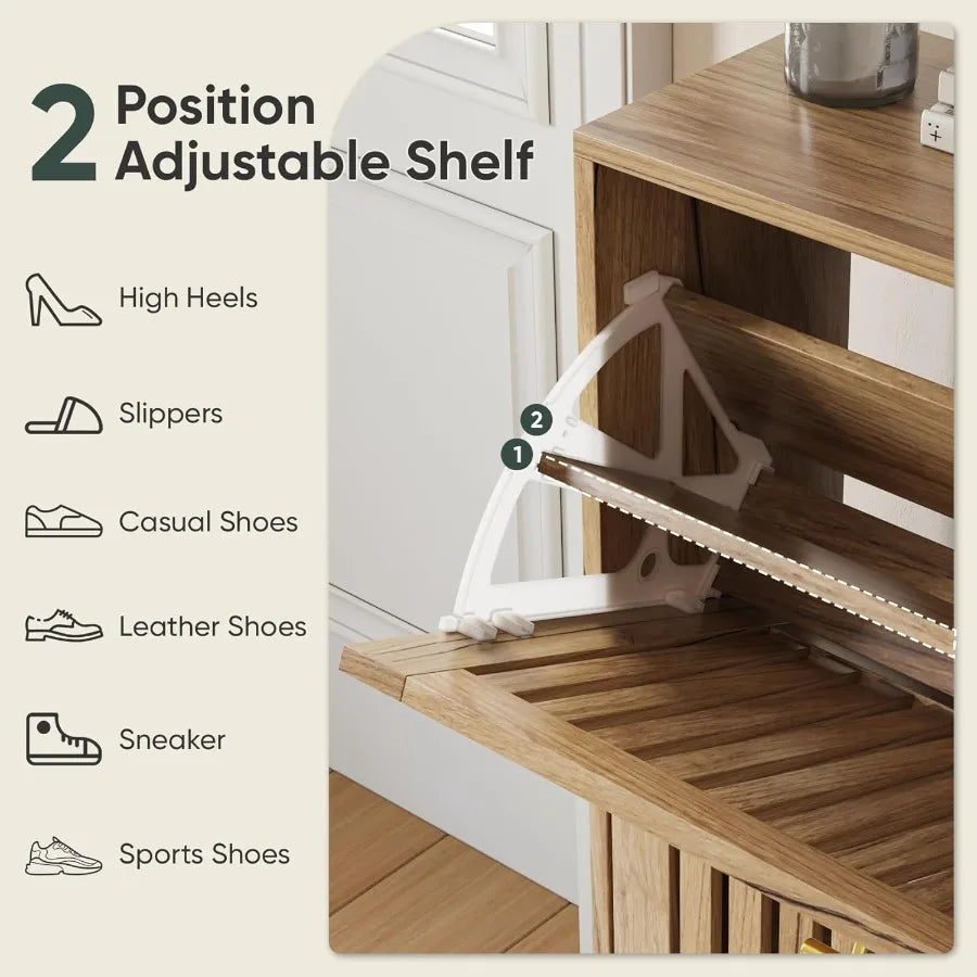 【Modern and Farmhouse Design】This shoe cabinet features unique grille-striped drawers that showcase its distinctive design. The natural oak finish not only enhances the aesthetic appeal of your entryway but also ensures good airflow inside the cabinet, seamlessly combining rustic charm with modern elegance. The gold handles and solid wood legs complement it beautifully, making it a perfect fit for any decor style