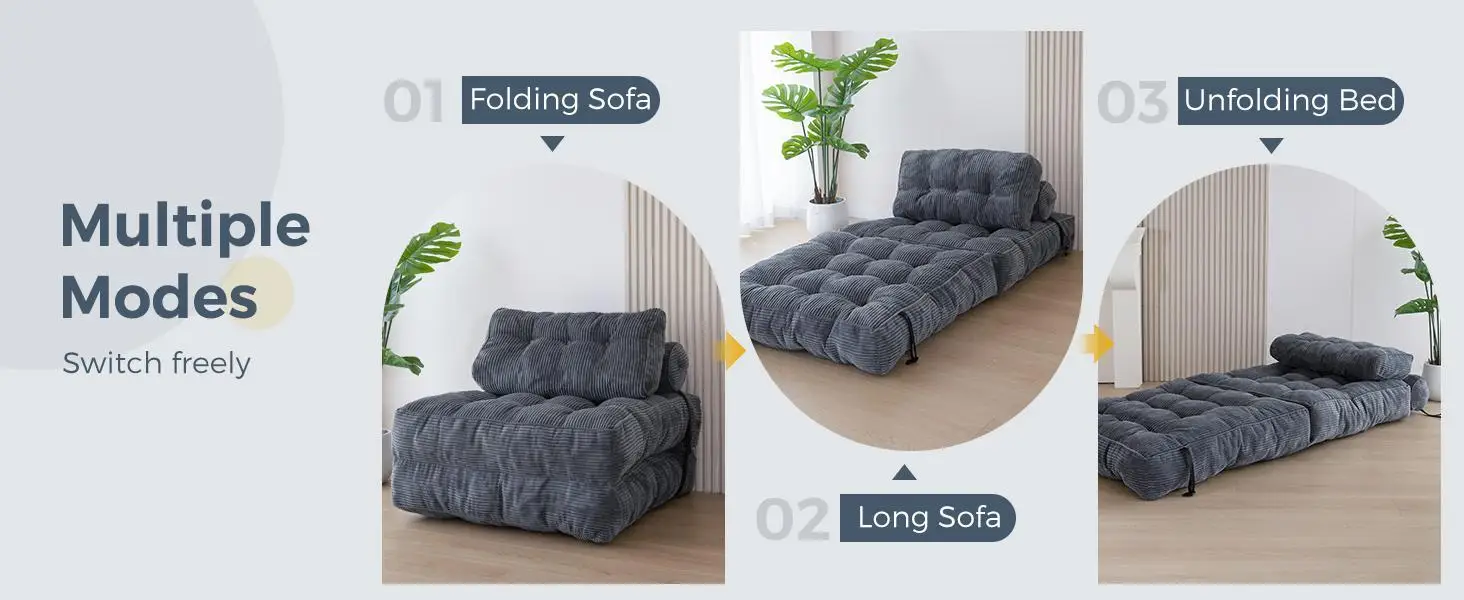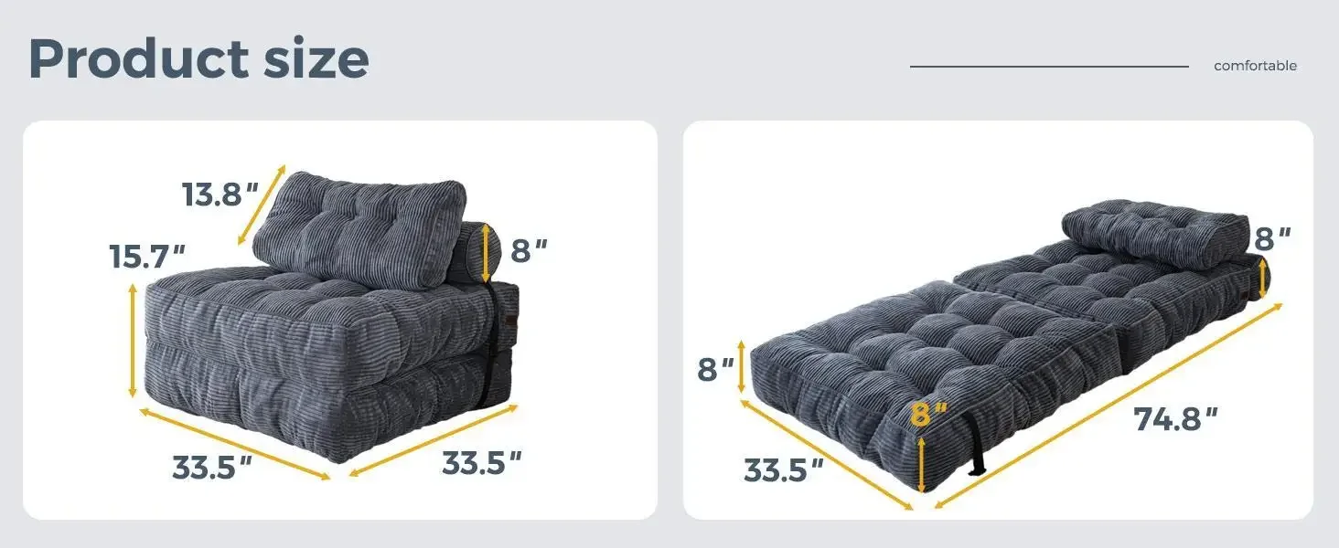 - Durable Fabric: Crafted from premium corded fabric, this material offers a unique visual and tactile experience, elevating the ambiance of your living space. The size of the folding sofa bed is about 33.5"x74.8", which would be tailored to provide comfortable seating or bed for one person