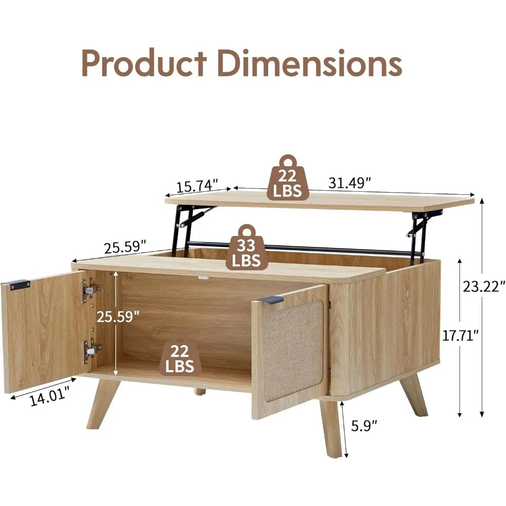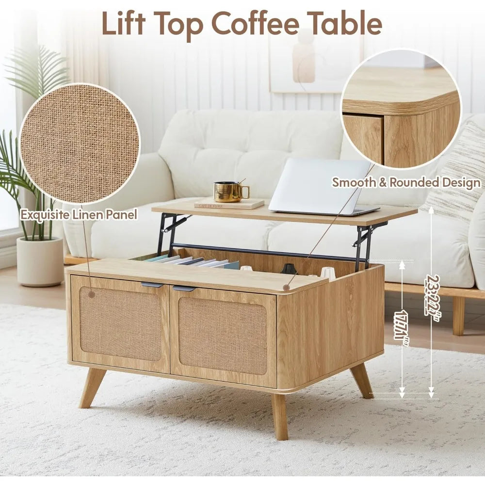 Wood Lift Top Coffee Table with Storage, Boho Modern Coffee Table with Nature Linen Doors & Large Hidden Storage, Rounded